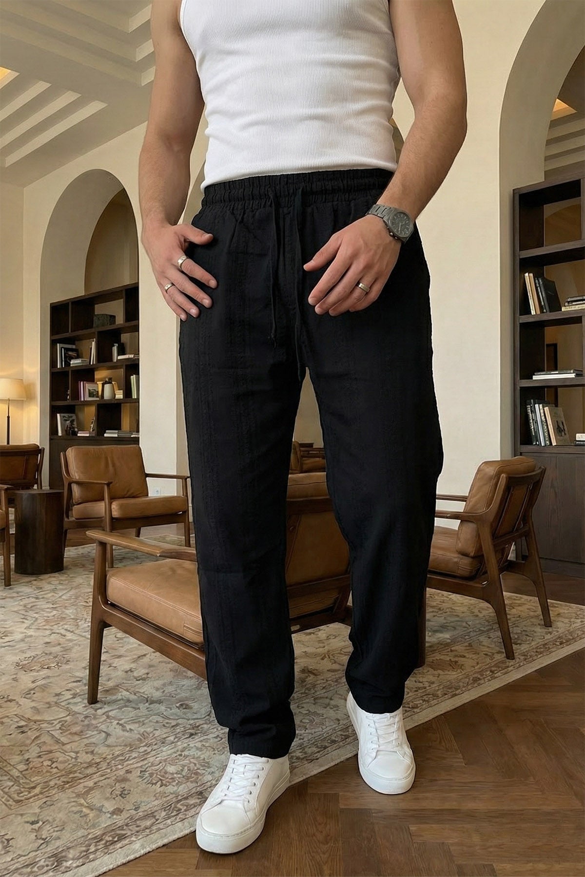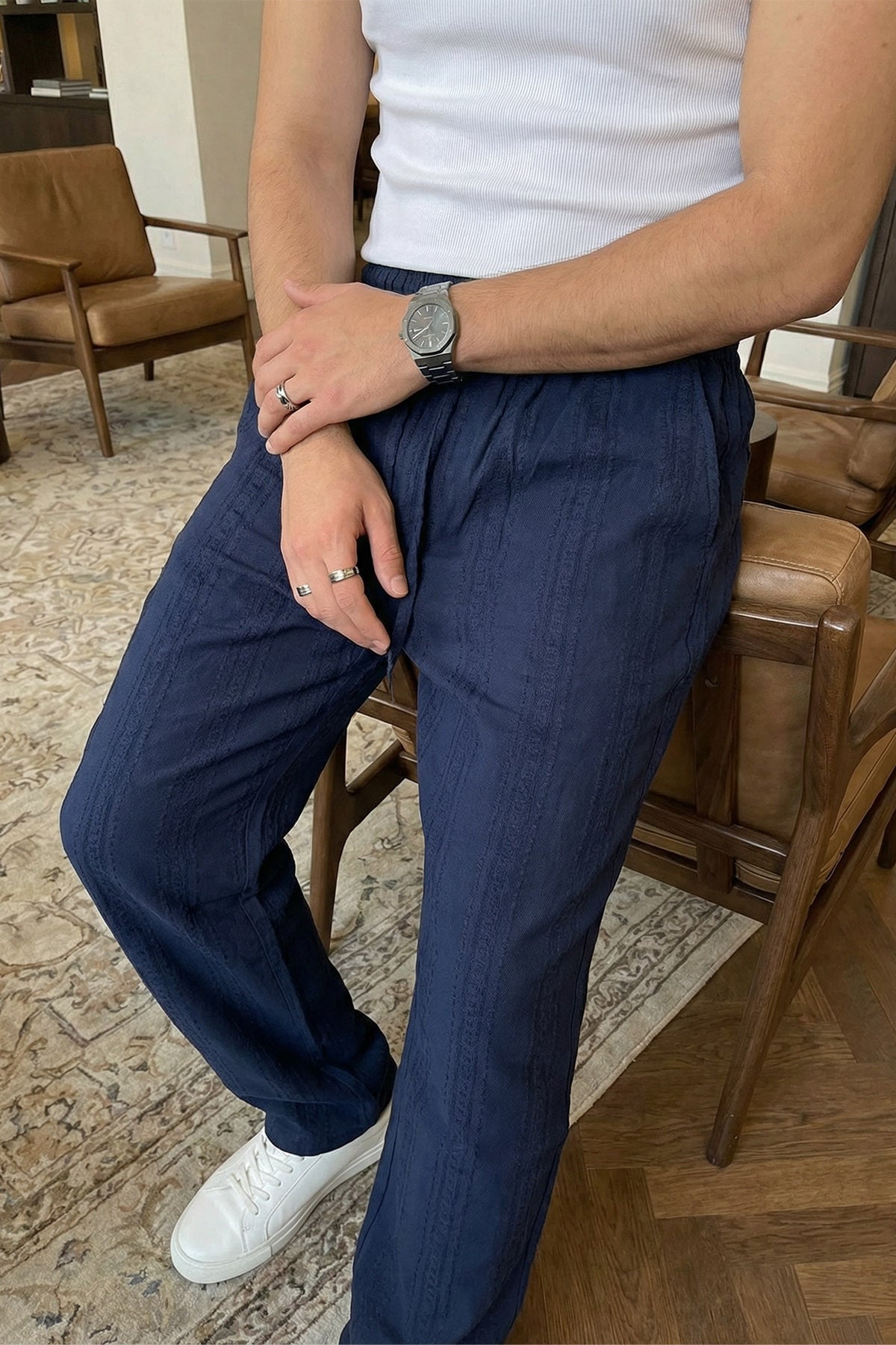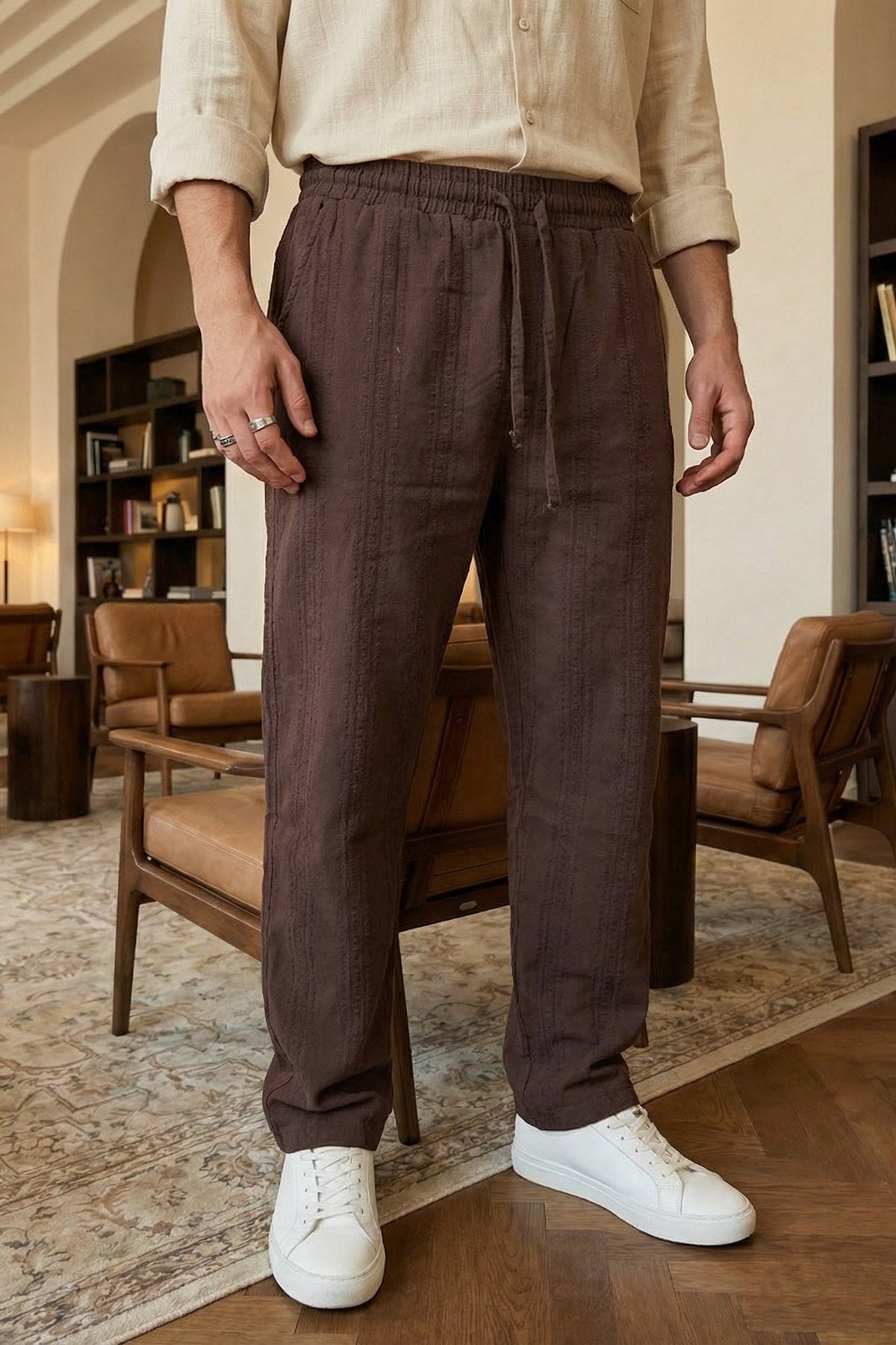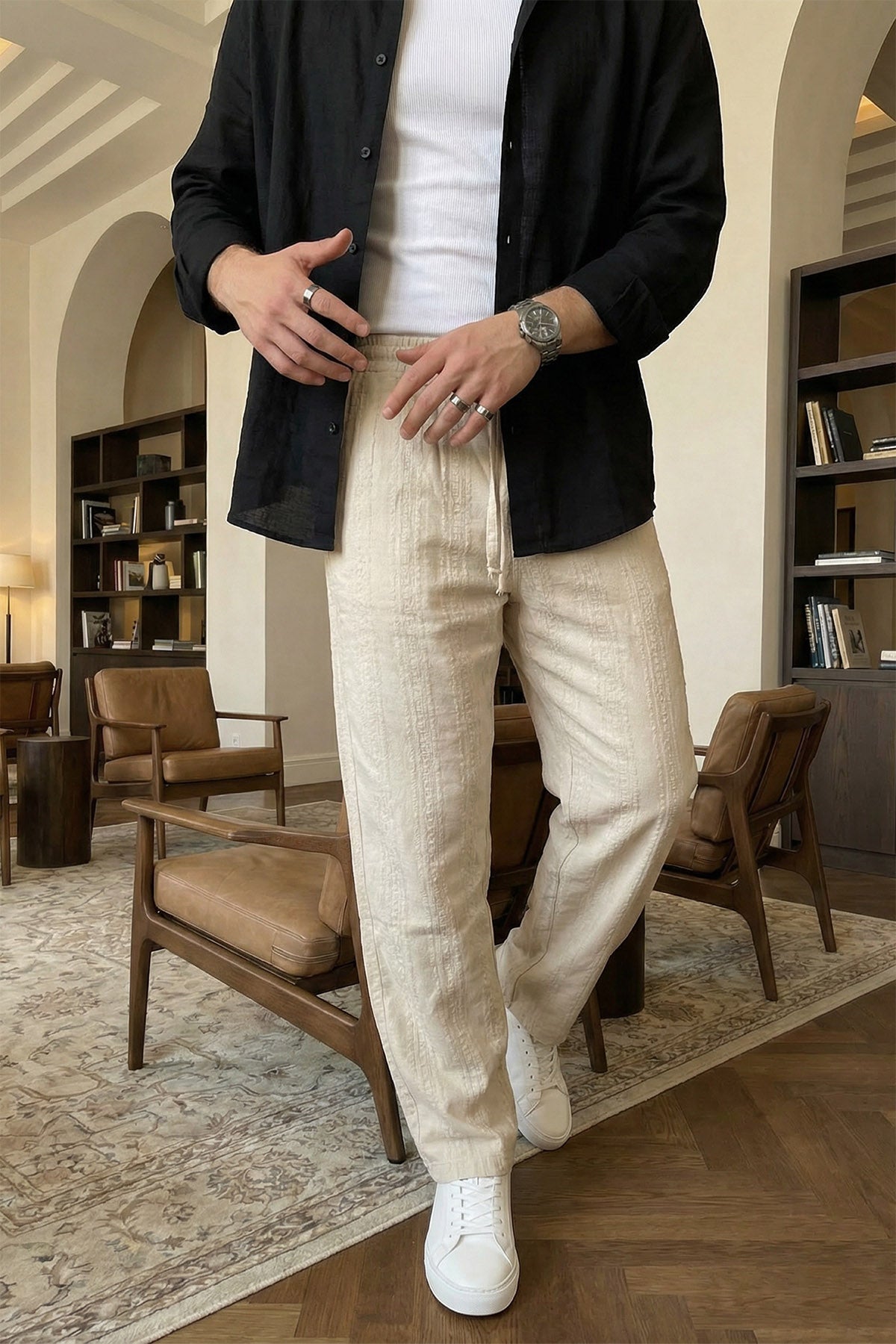 Bunga Desenli Keten Görünümlü Lastikli Erkek Pantolon