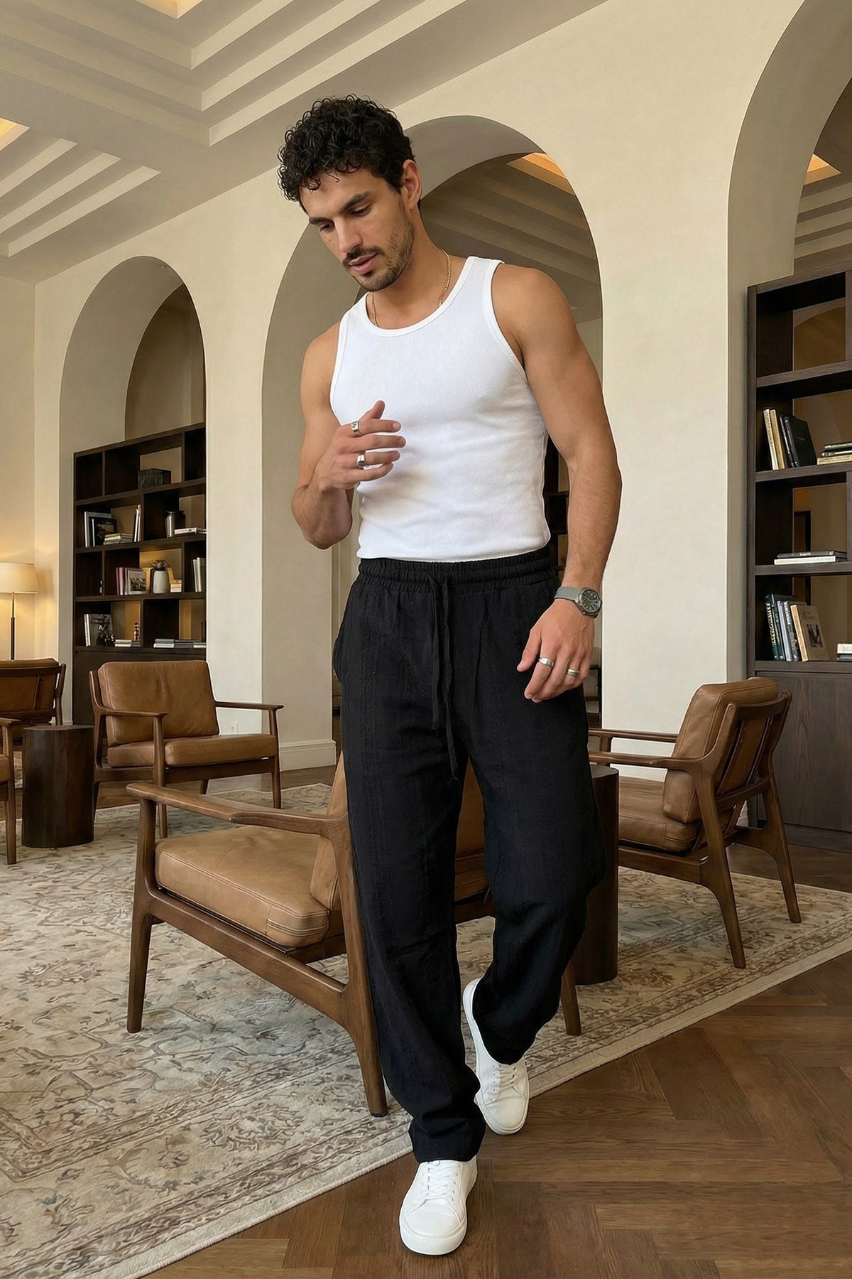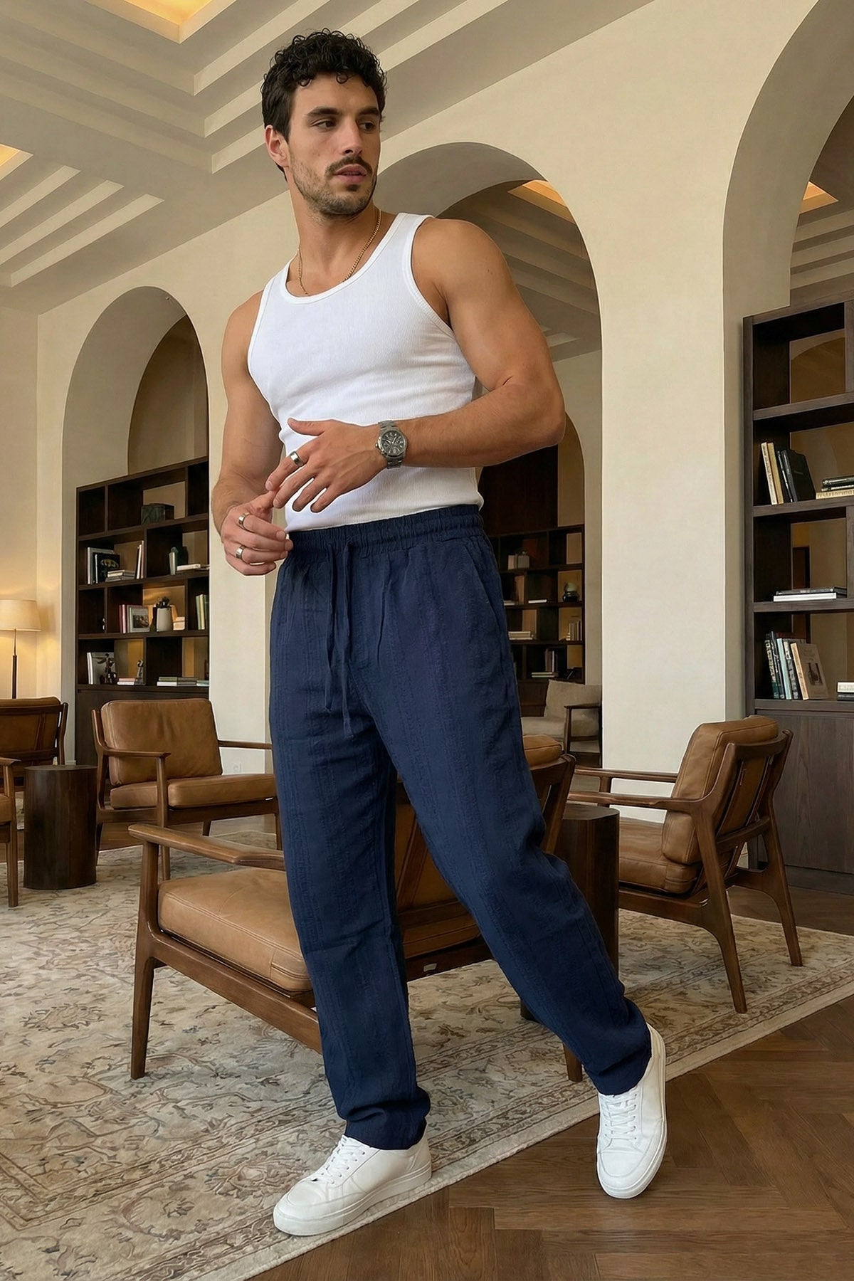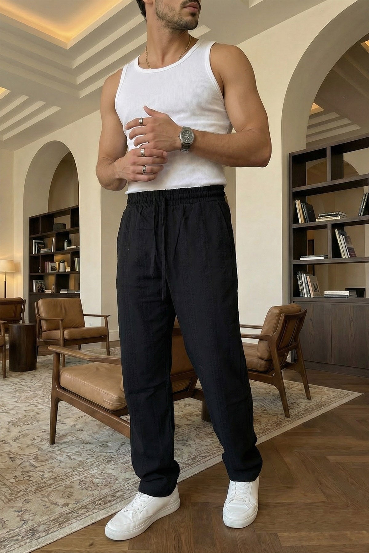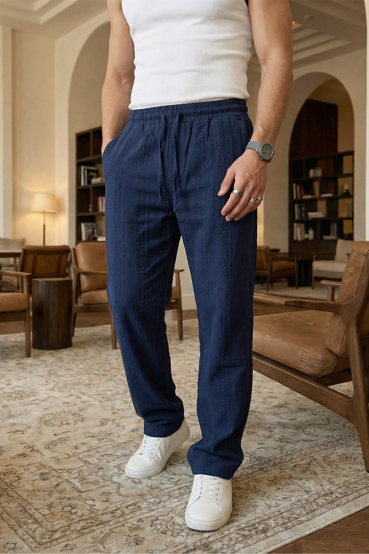 Bunga Desenli Keten Görünümlü Lastikli Erkek Pantolon
