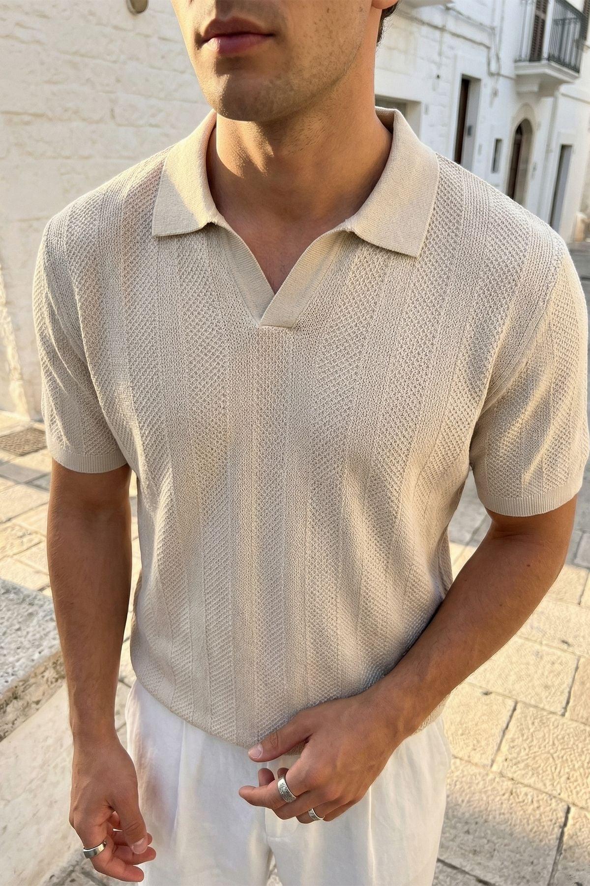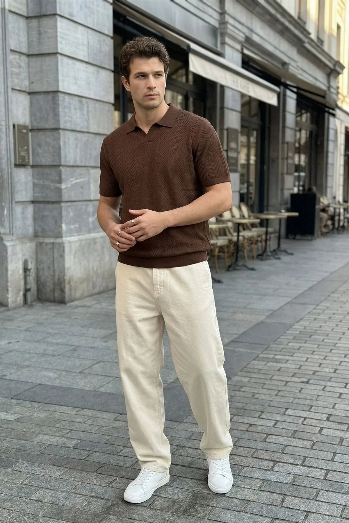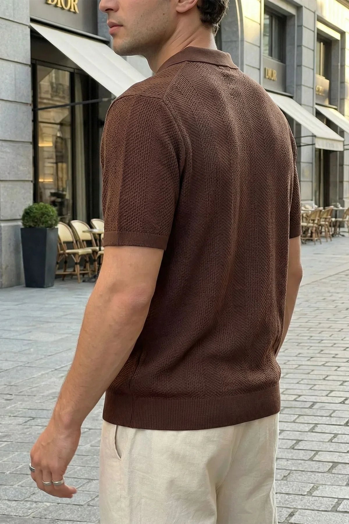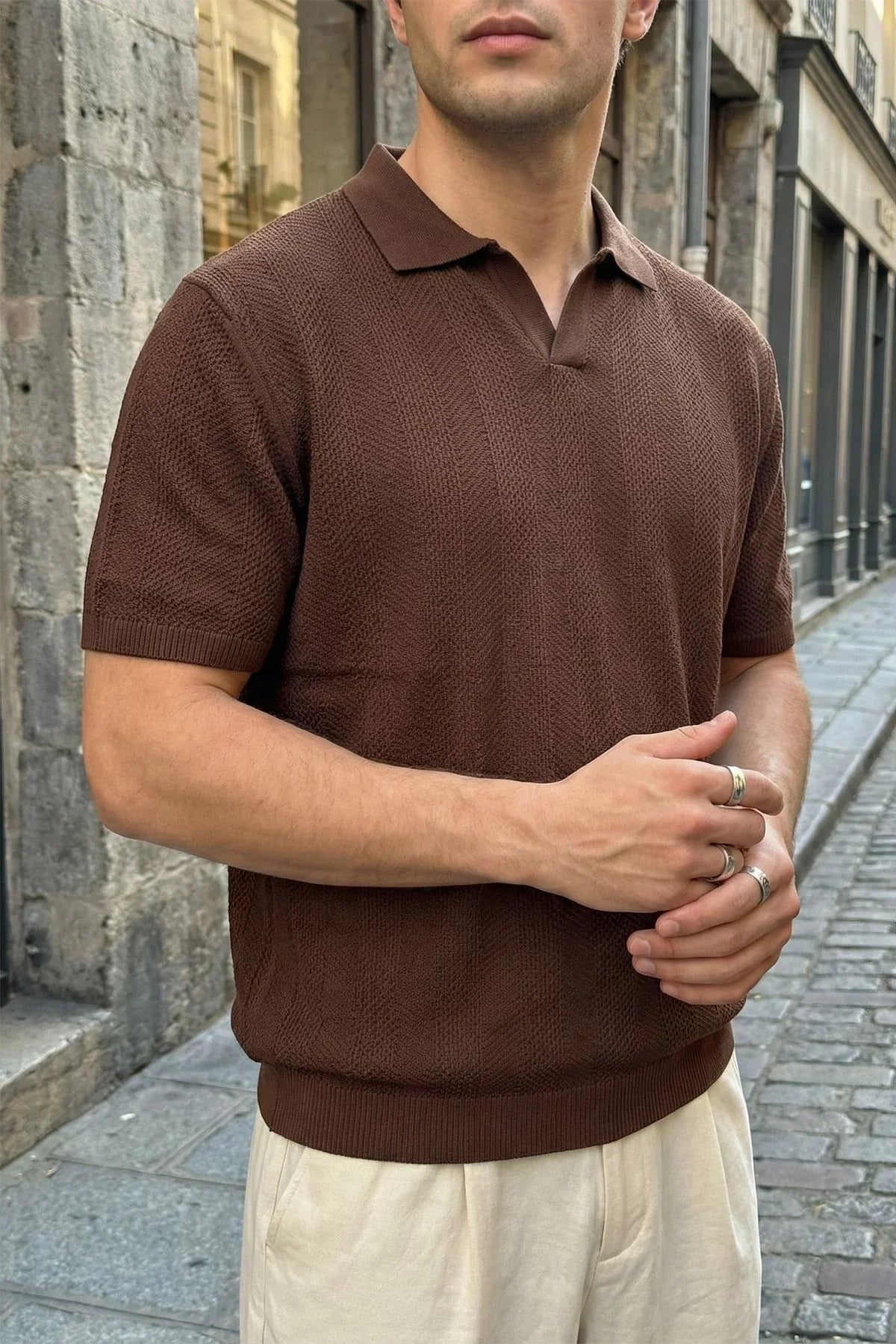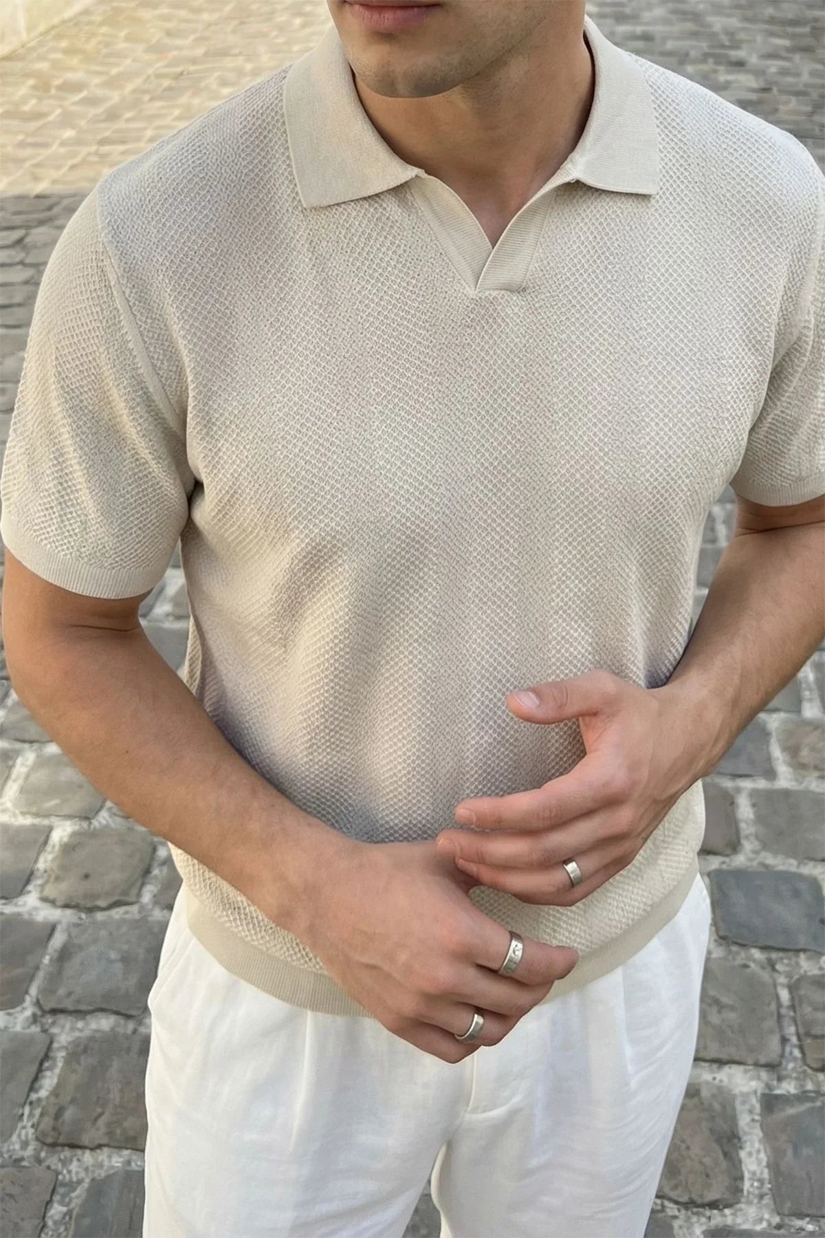 Onor Erkek Kendinden Desenli Polo Yaka Triko Tişört Geniş Kalıp Hafif Doku