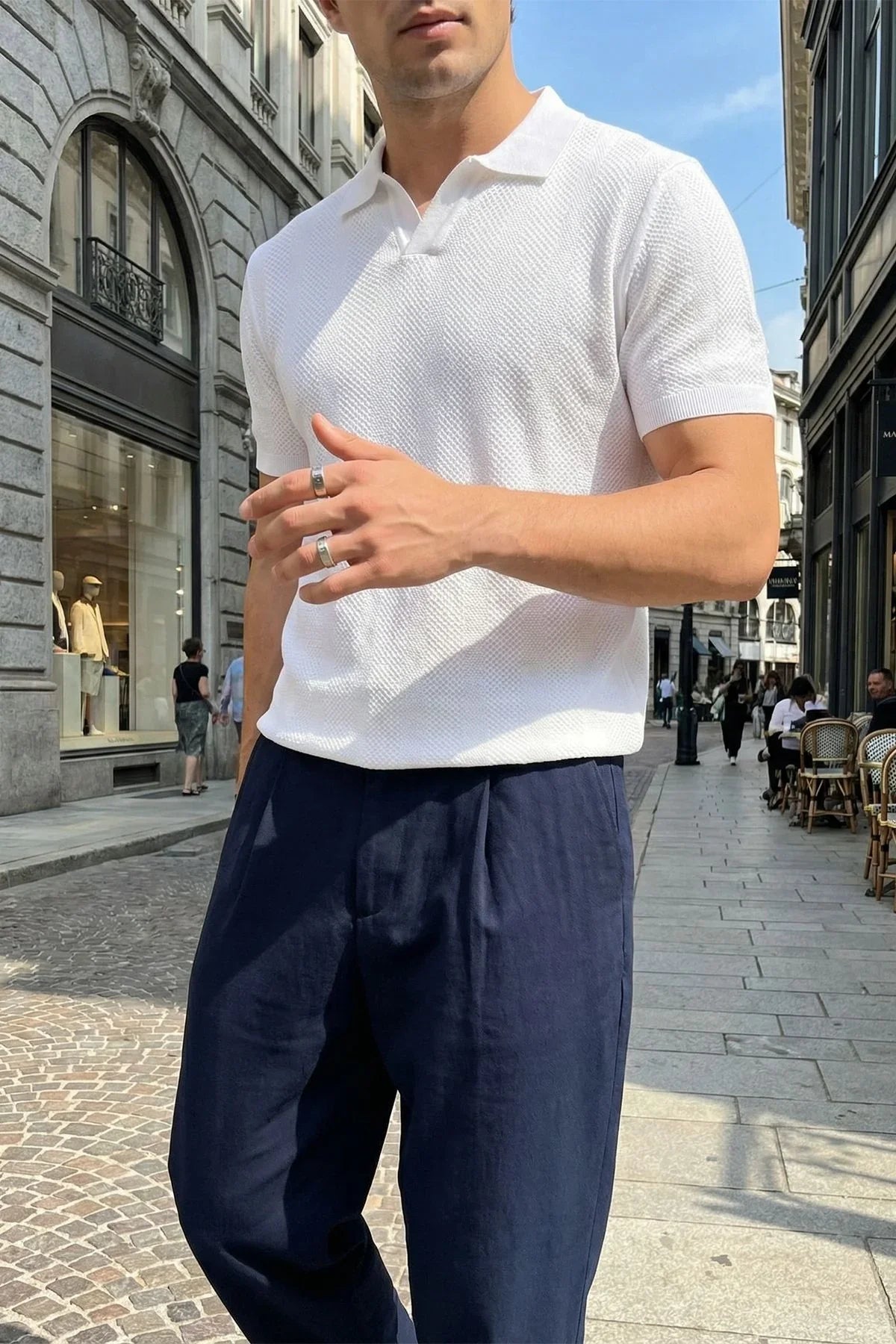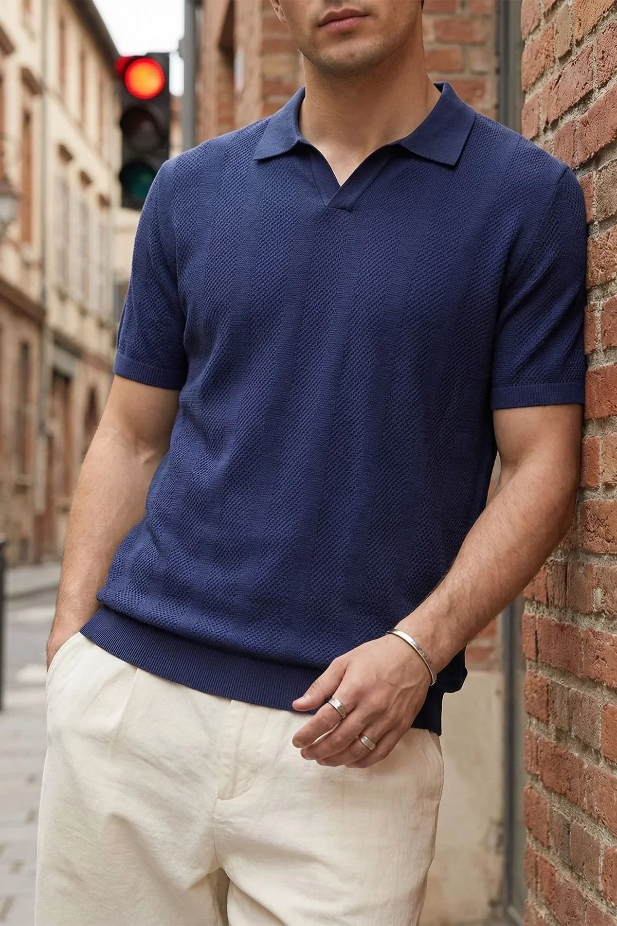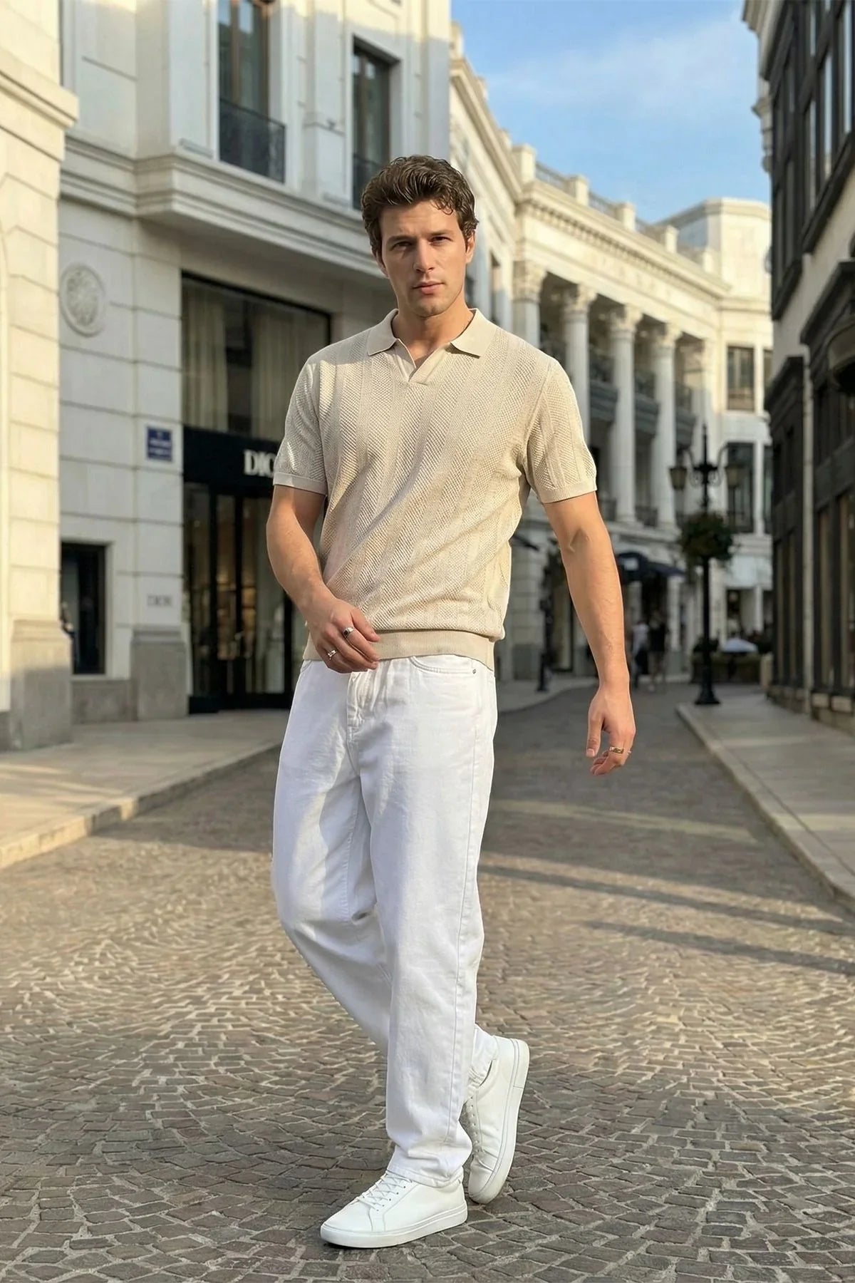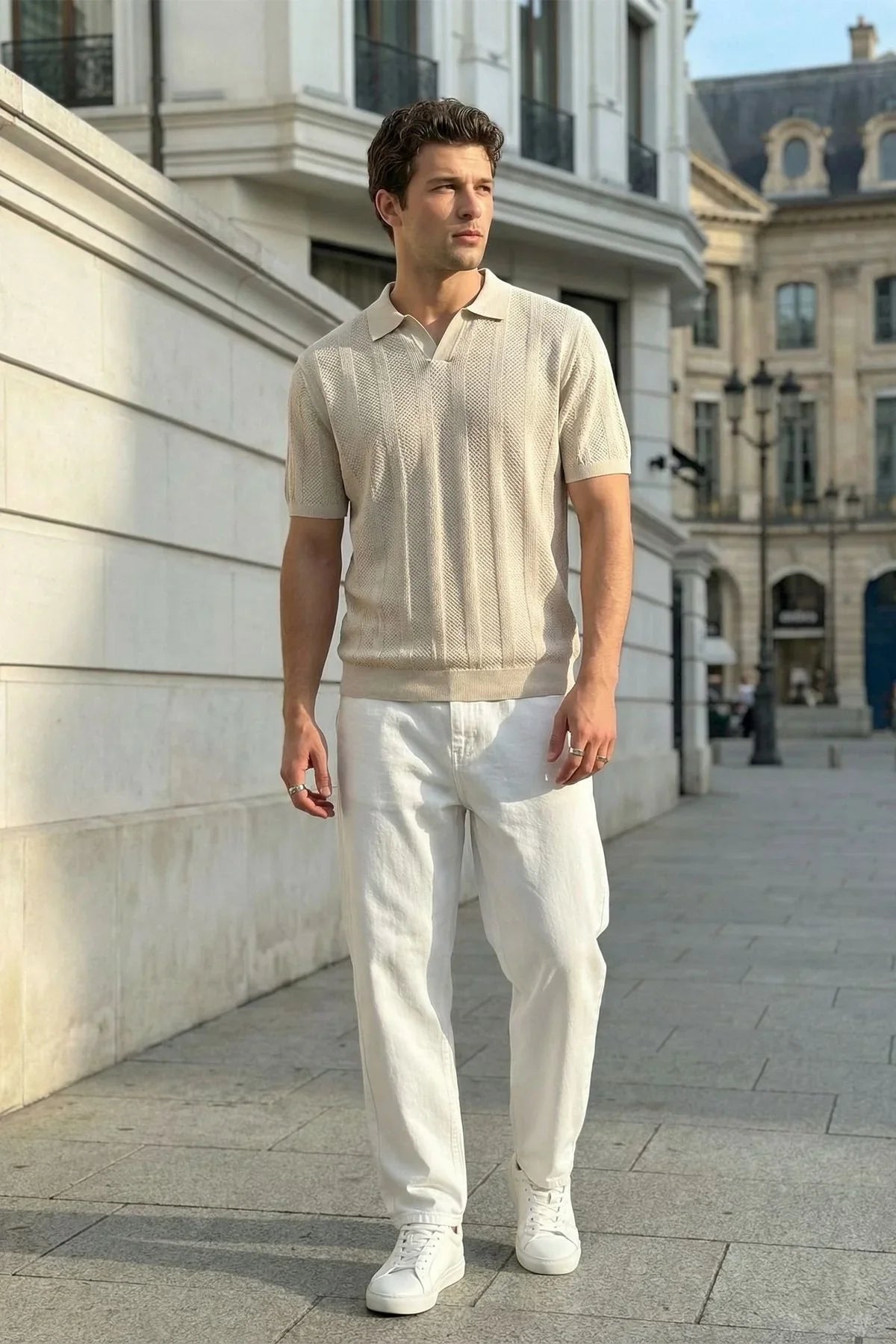 Onor Erkek Kendinden Desenli Polo Yaka Triko Tişört Geniş Kalıp Hafif Doku