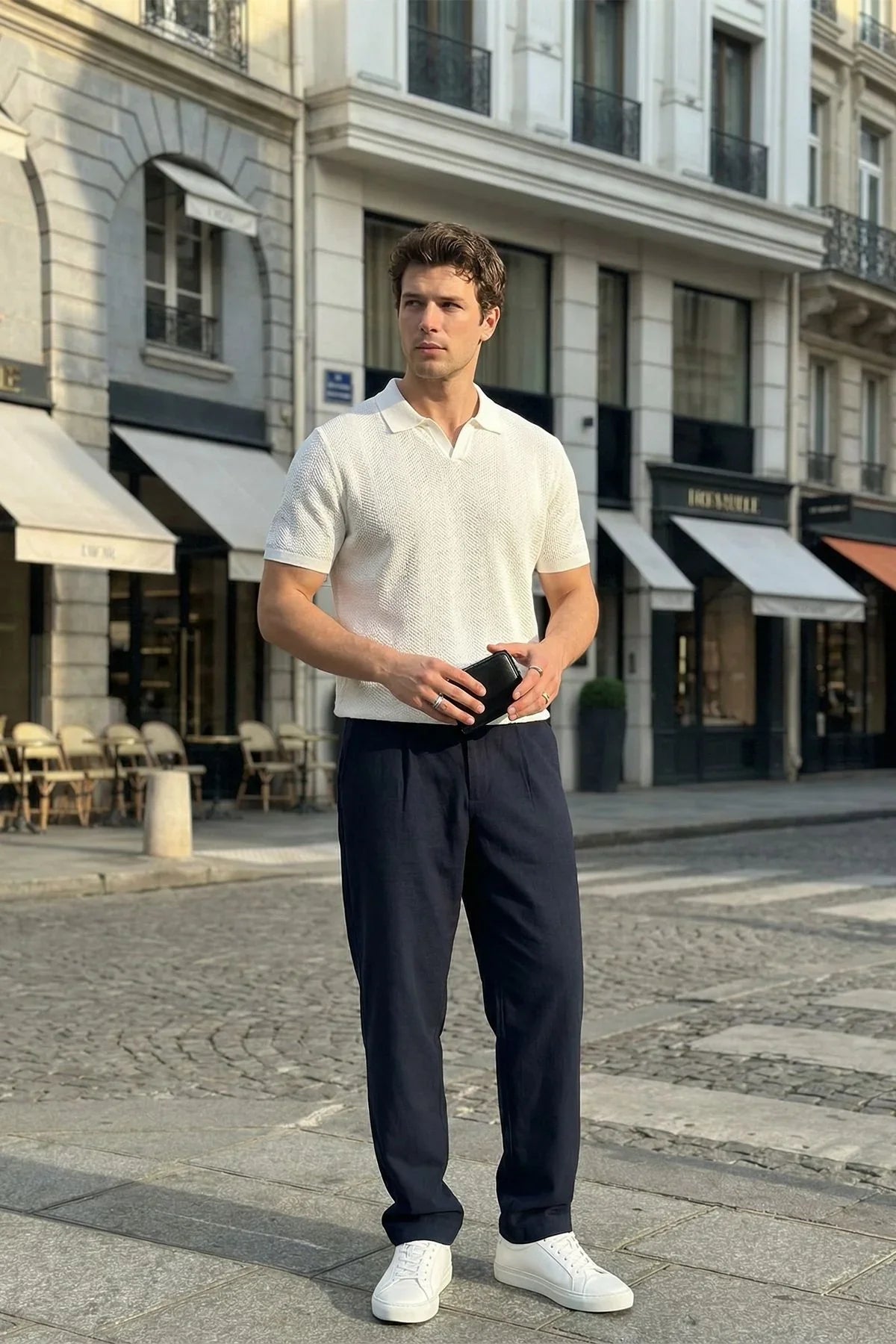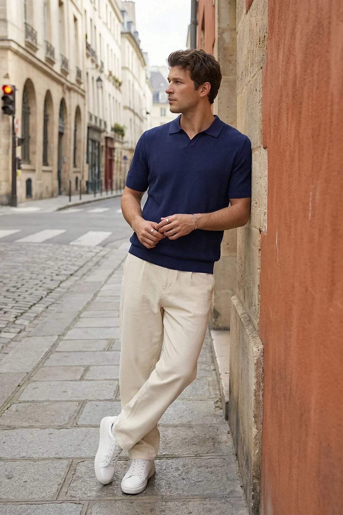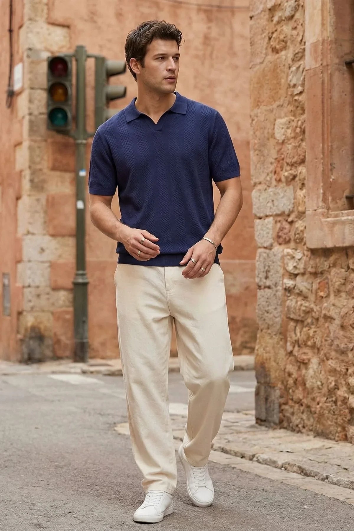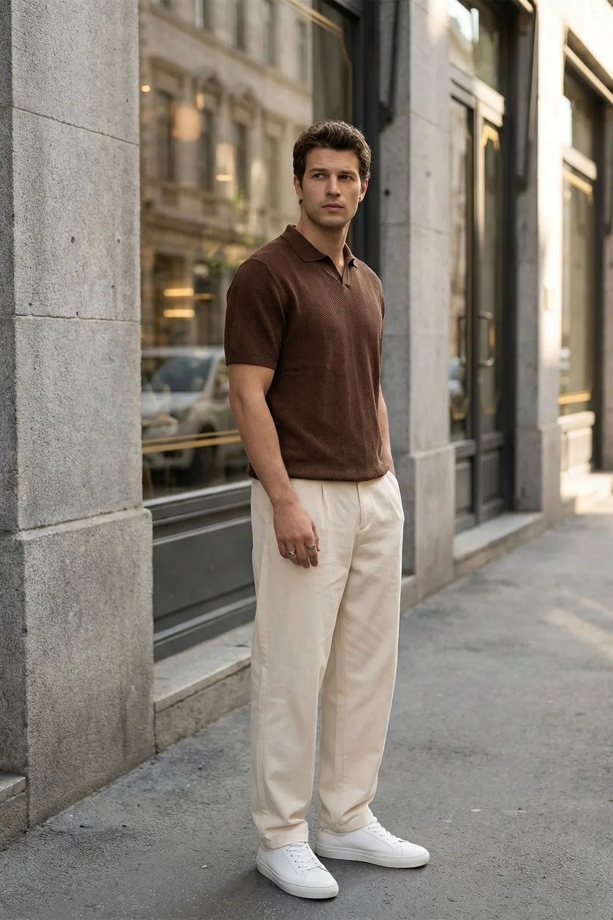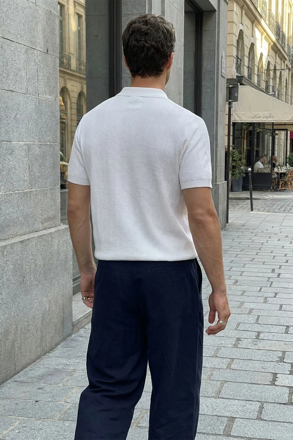 Onor Erkek Kendinden Desenli Polo Yaka Triko Tişört Geniş Kalıp Hafif Doku