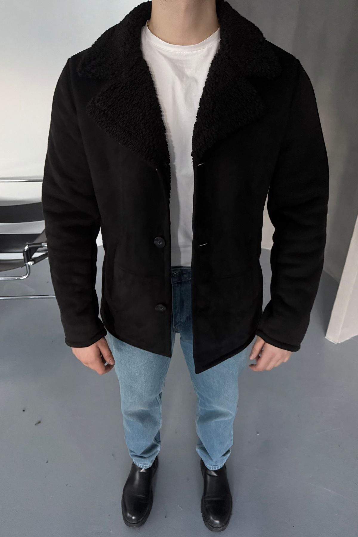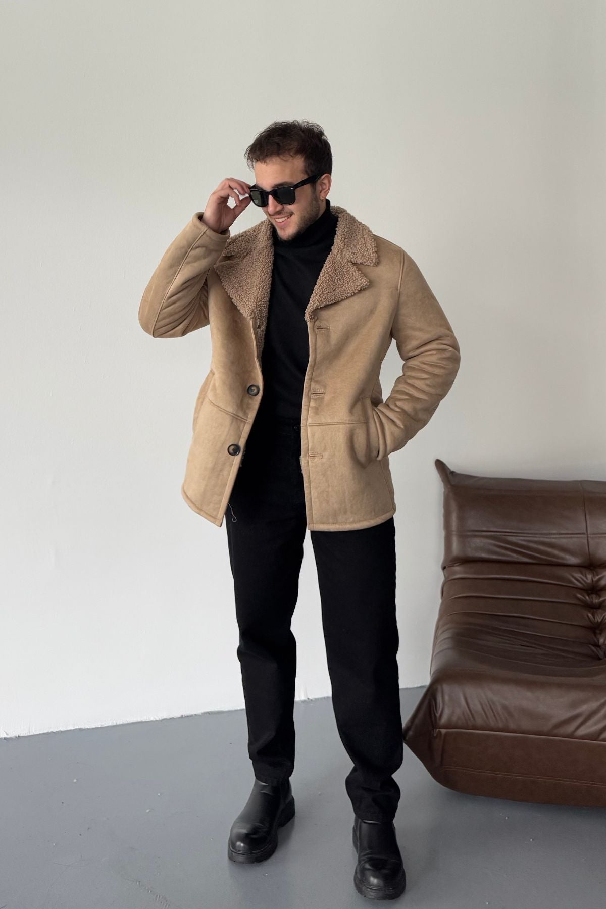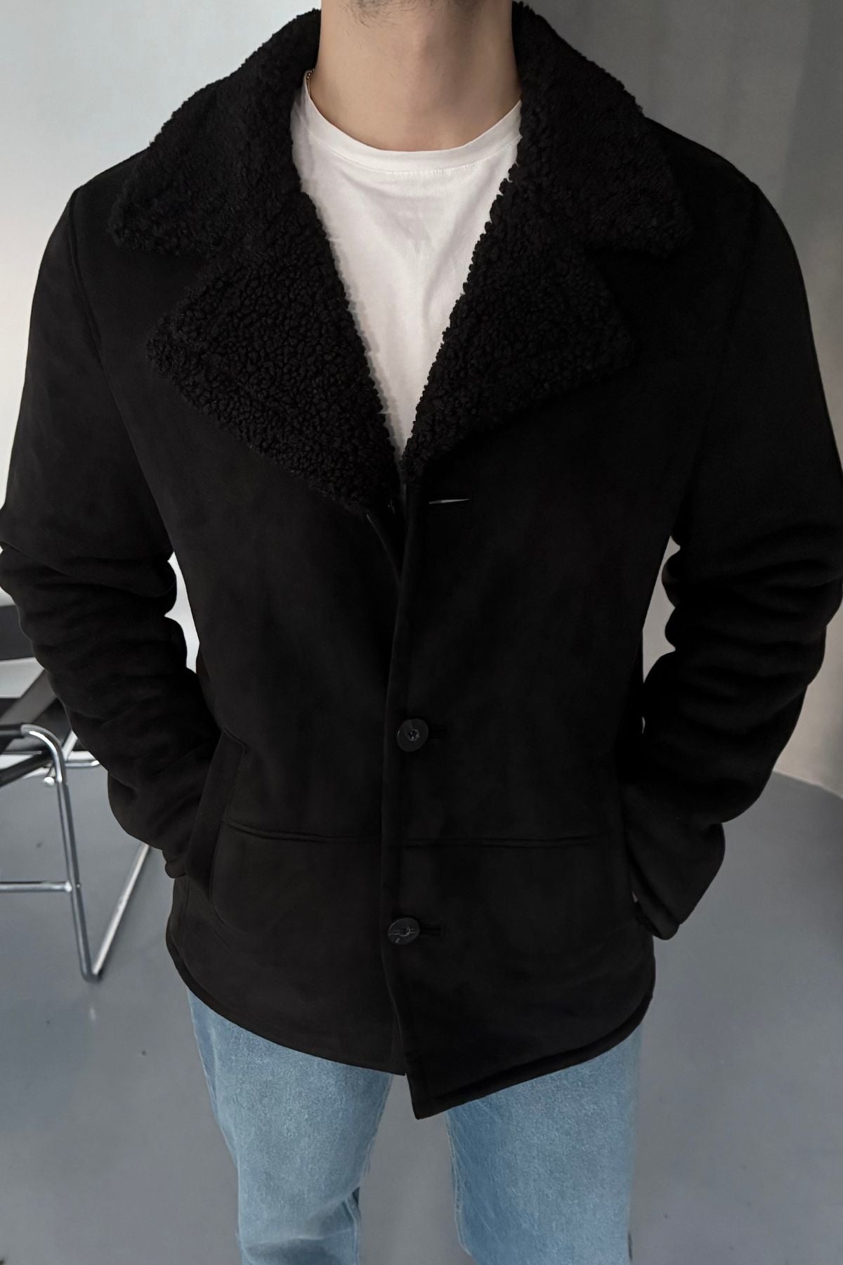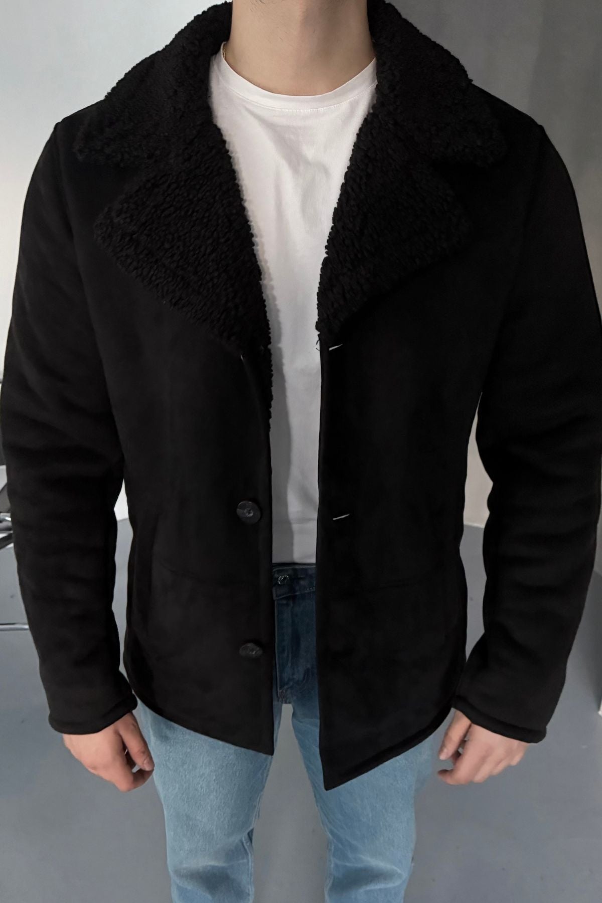 Erkek Regular Fit Içi Kürklü Düğmeli Katlı Yaka Yandan Cepli Klasik Süet Mont