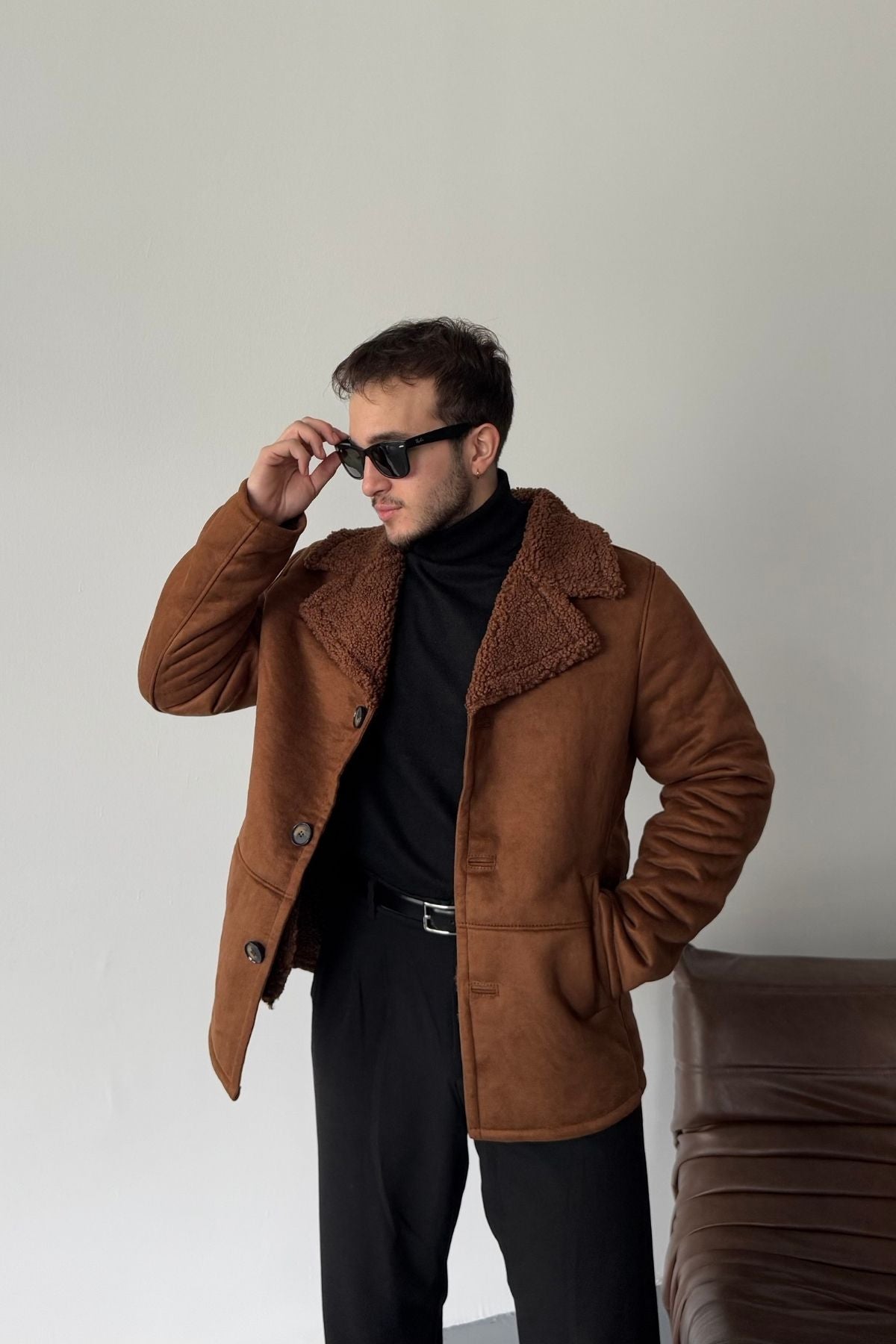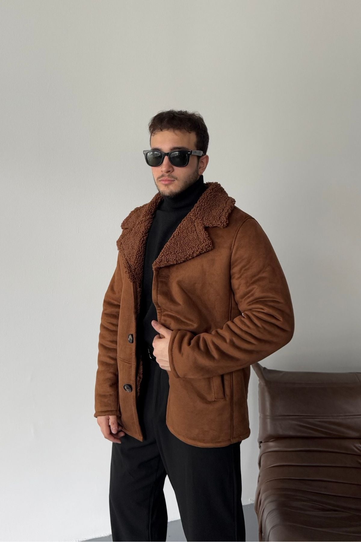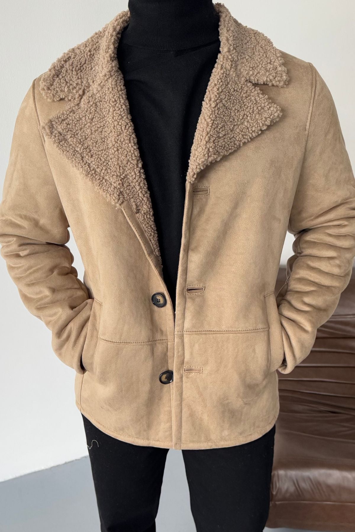 Erkek Regular Fit Içi Kürklü Düğmeli Katlı Yaka Yandan Cepli Klasik Süet Mont