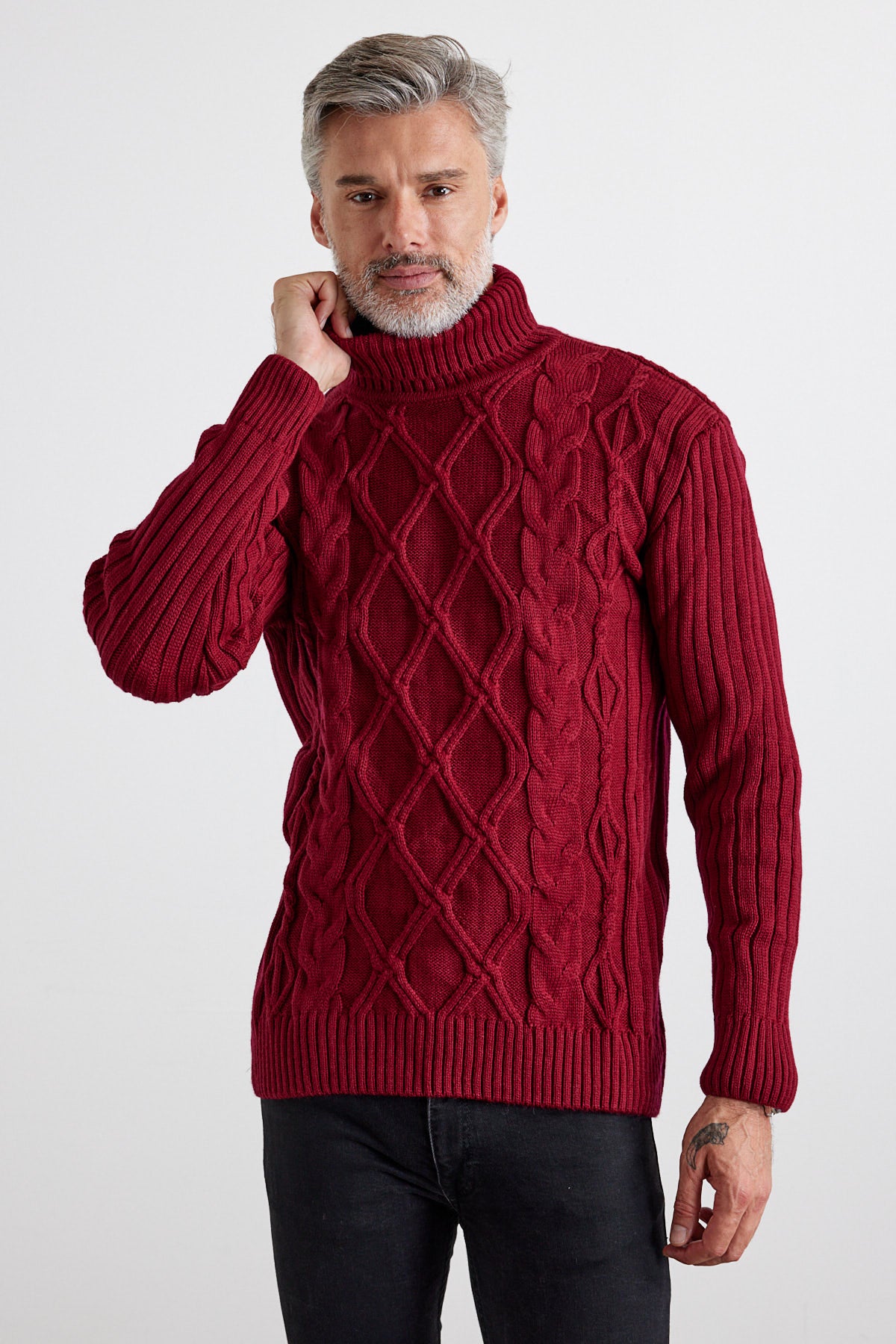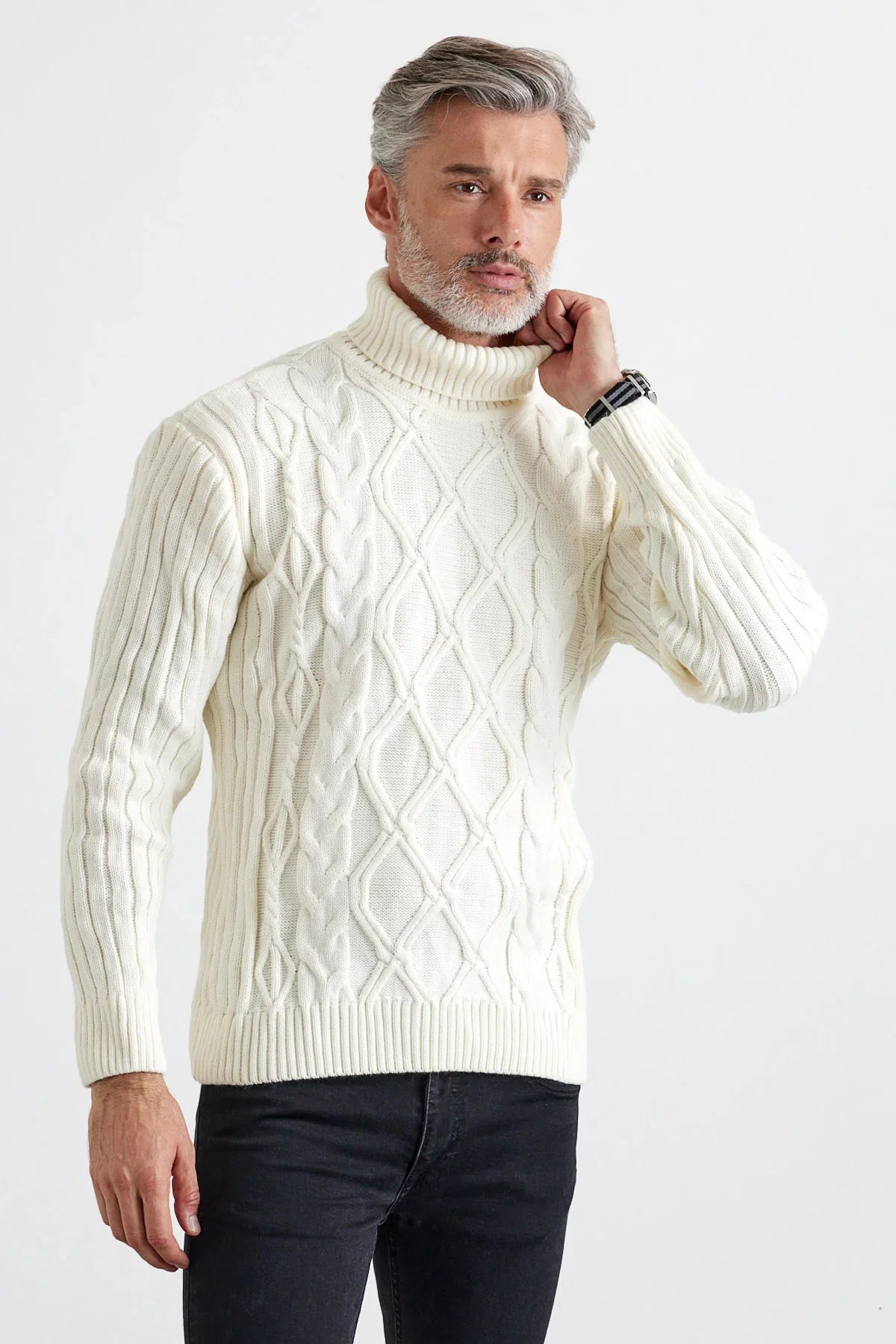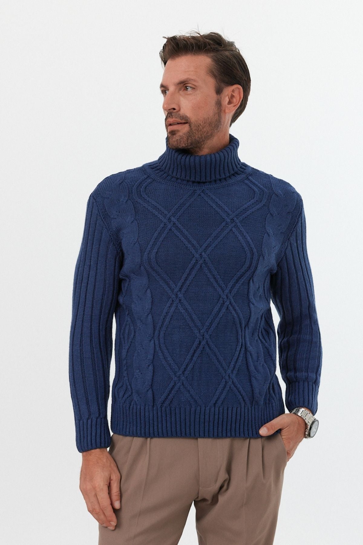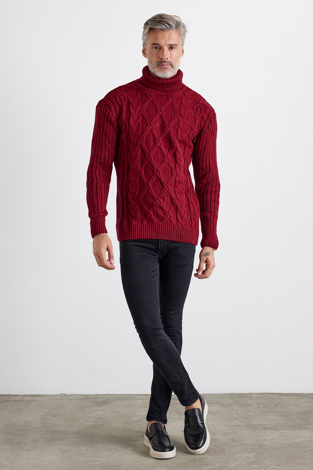 Erkek Saç Örgülü Baklava Desenli Tam Balıkçı Fitilli Kalın Triko Kazak