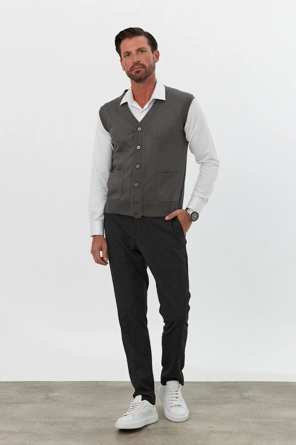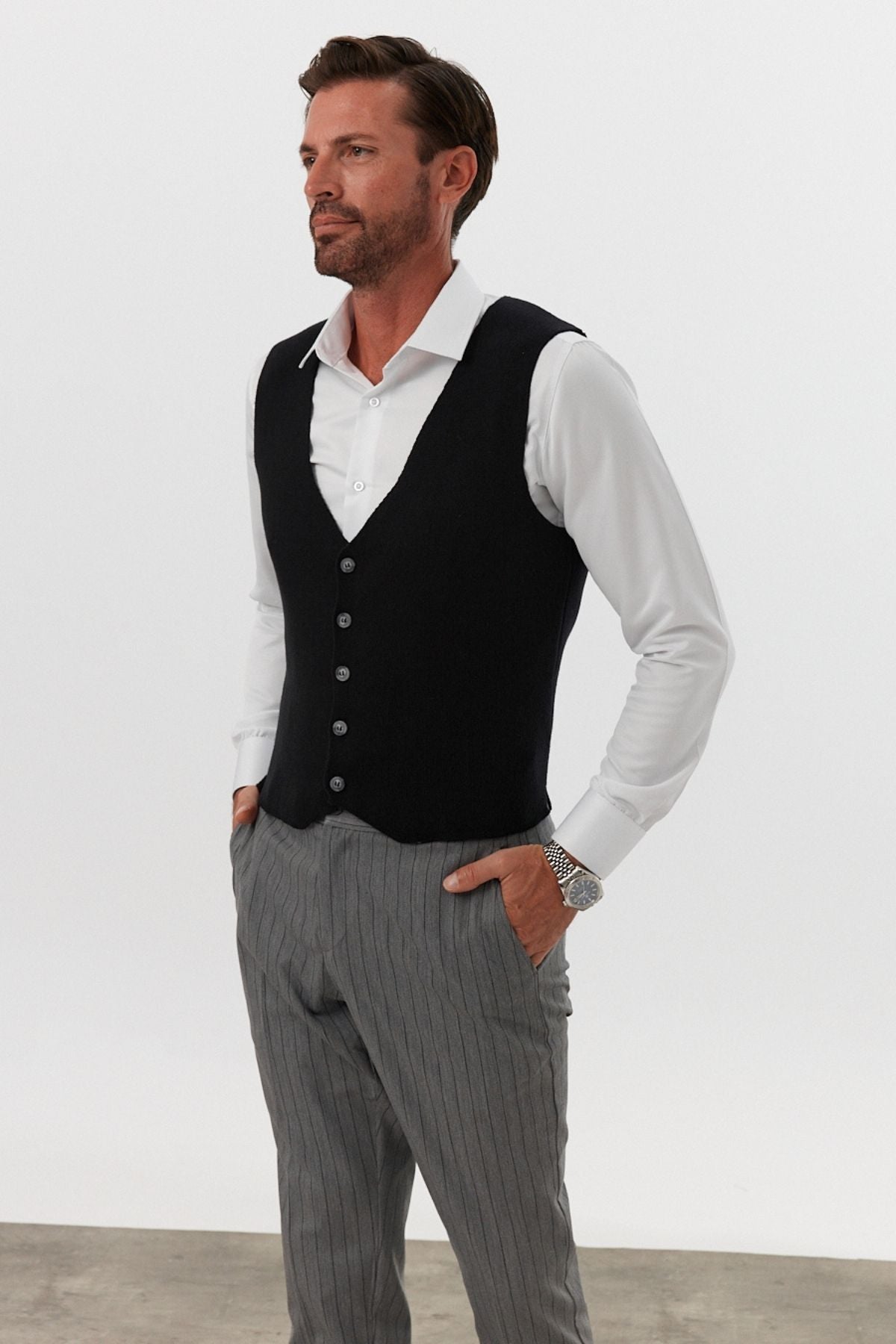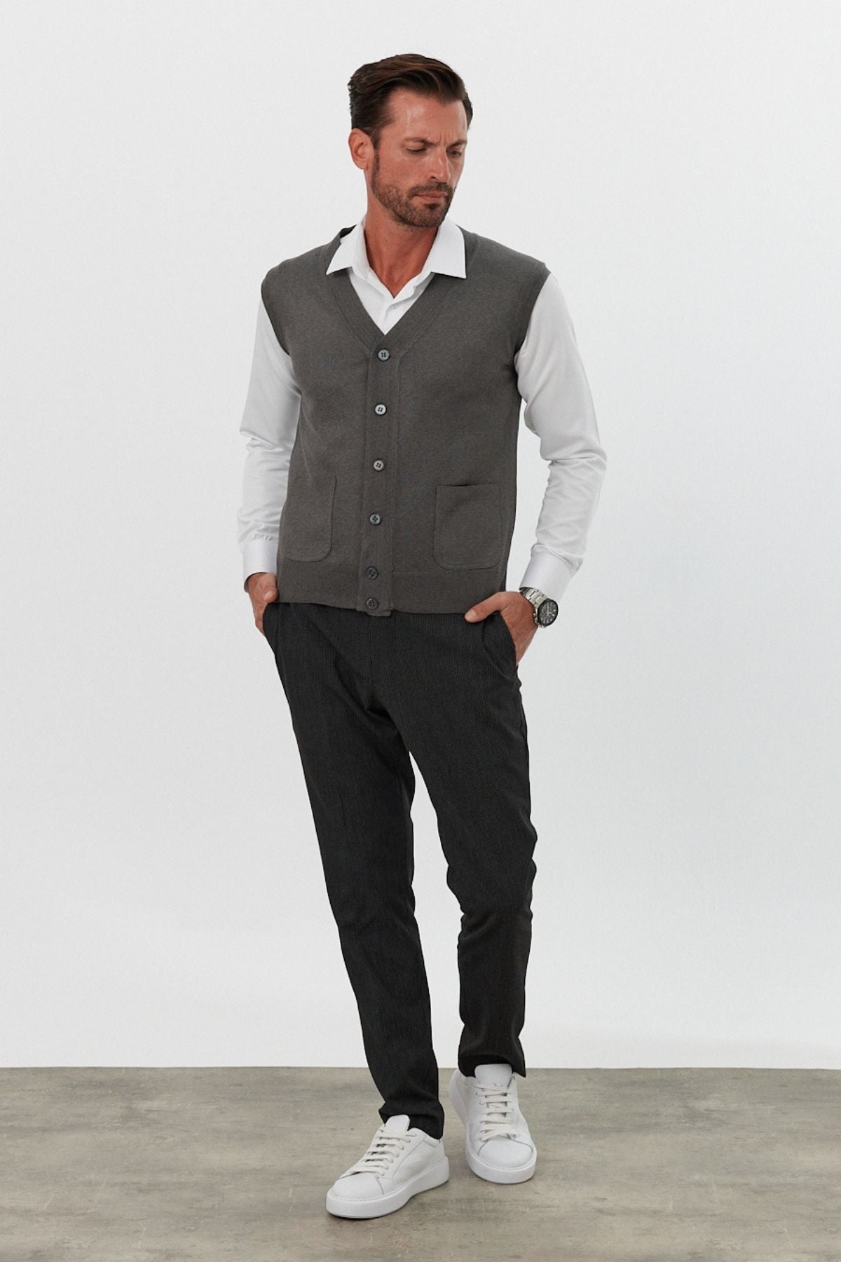 Livio Ferri yelekleri, kaliteli kumaşlarıyla hem dayanıklı hem de konforludur. Düğme detayları ve basit cepler, yeleğe işlevsellik katarken tasarımın genel sadeliğini korur. İnce ve hafif yapısı sayesinde gün boyu rahat bir kullanım sunar.