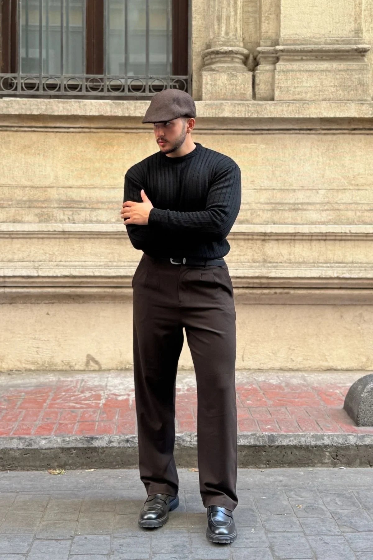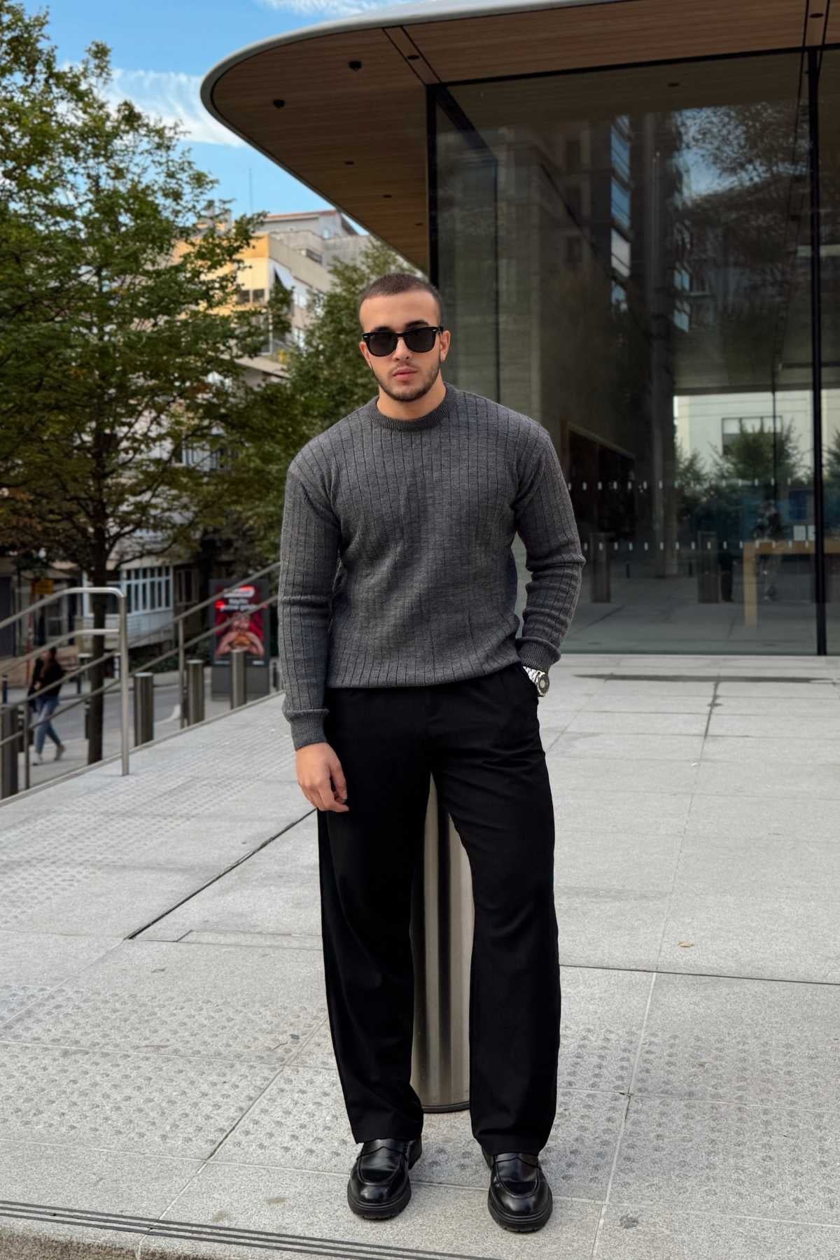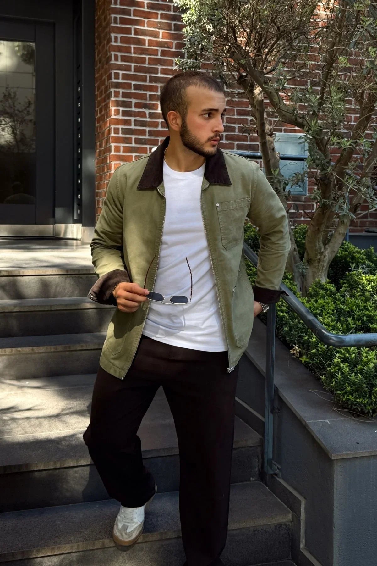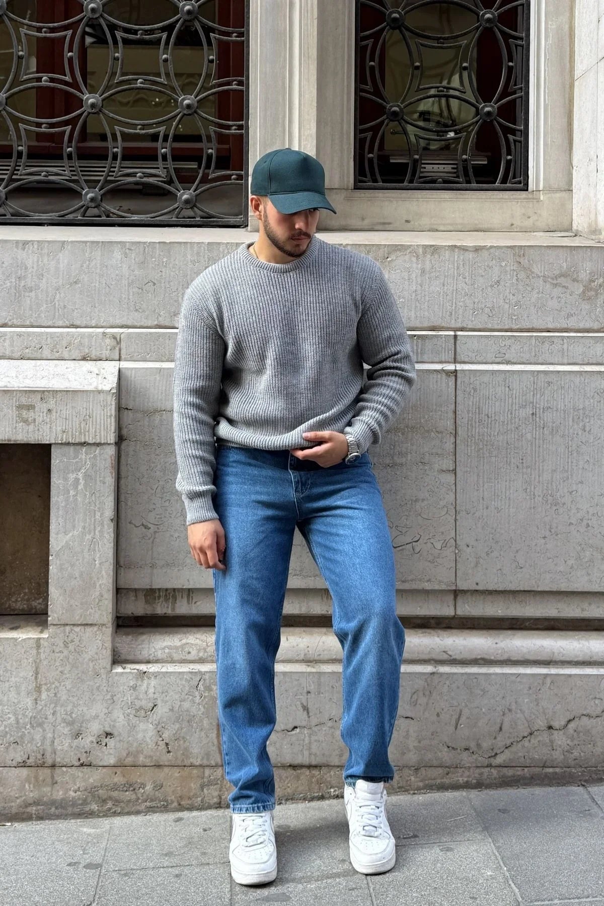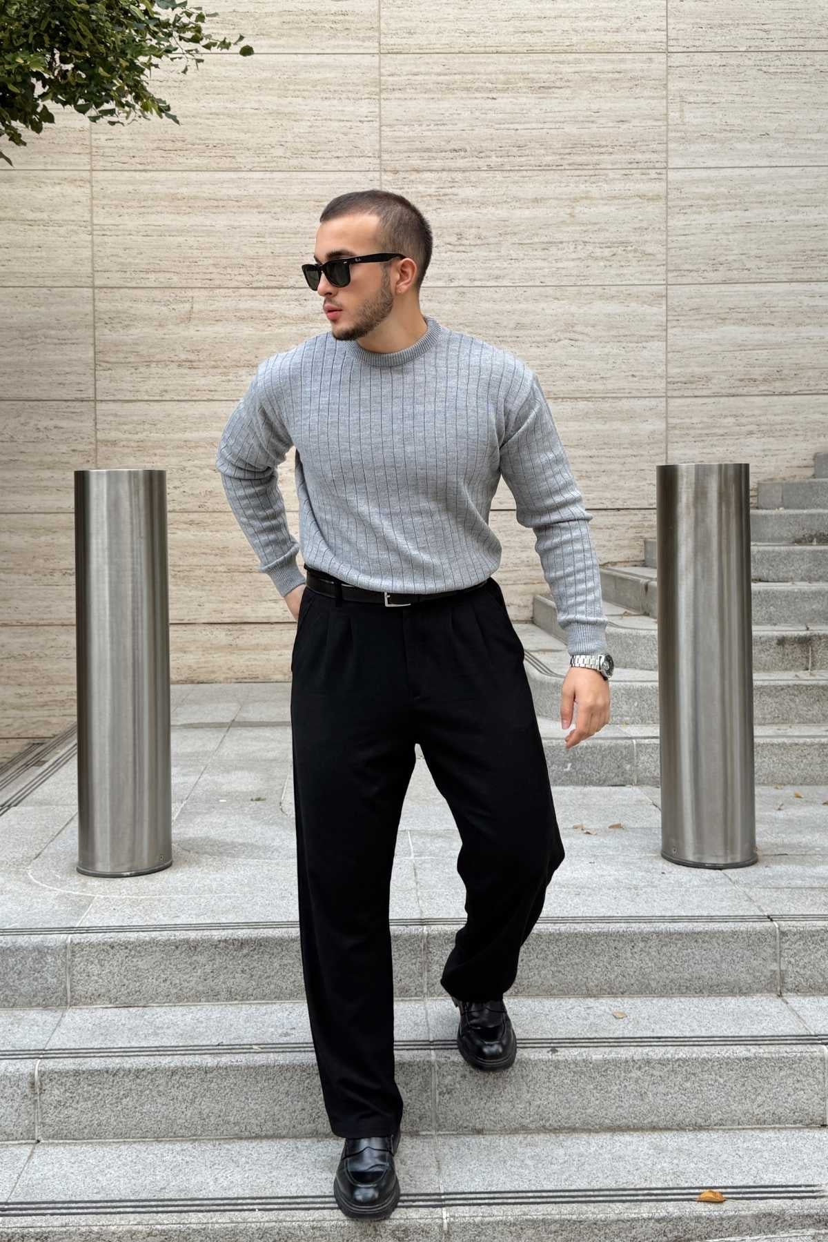 Triko kazaklar, kumaş baggy pantolon ve deri kemerle rahat ve modern bir görünüm yaratır. Kadife uzun kollu gömlek ceketler veya kadife yaka günlük ceketlerimizle farklı stiller oluşturulabilir.