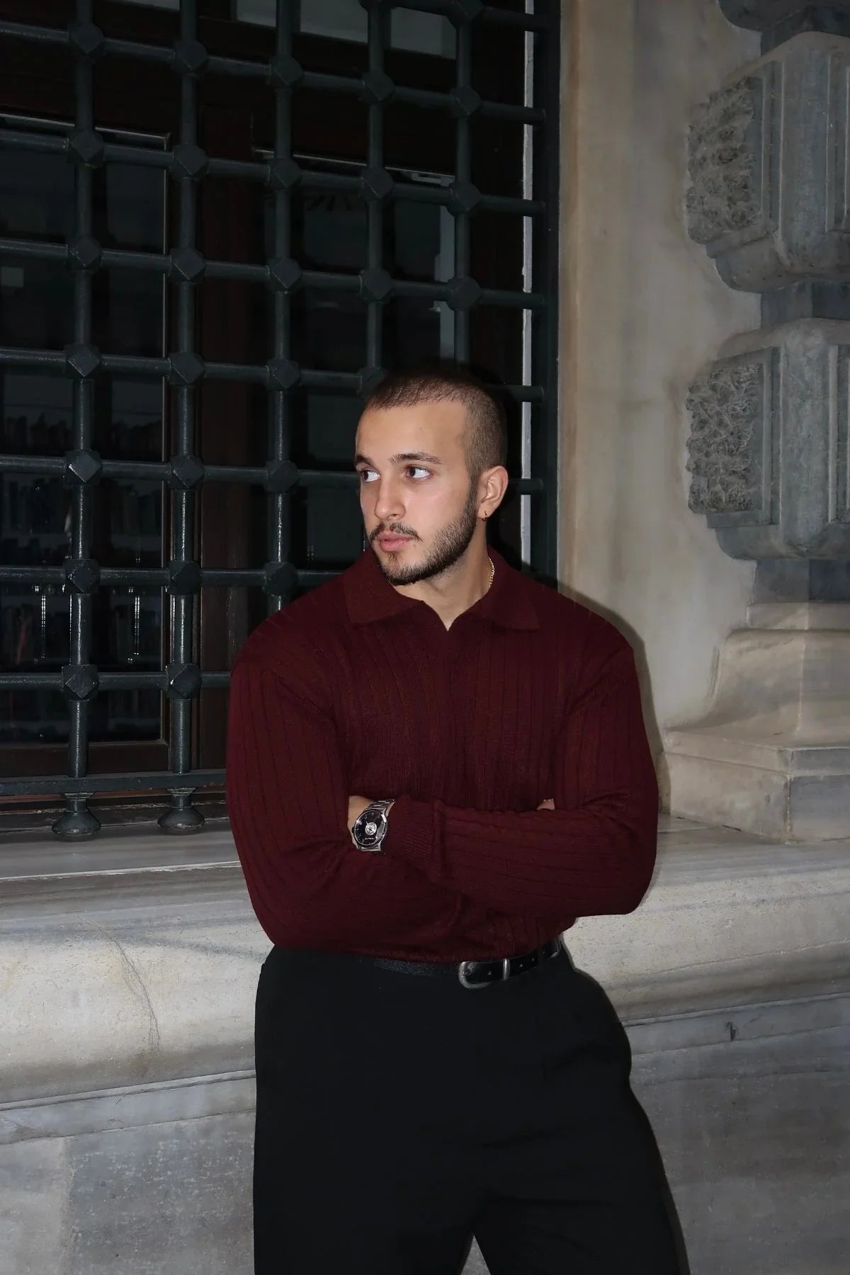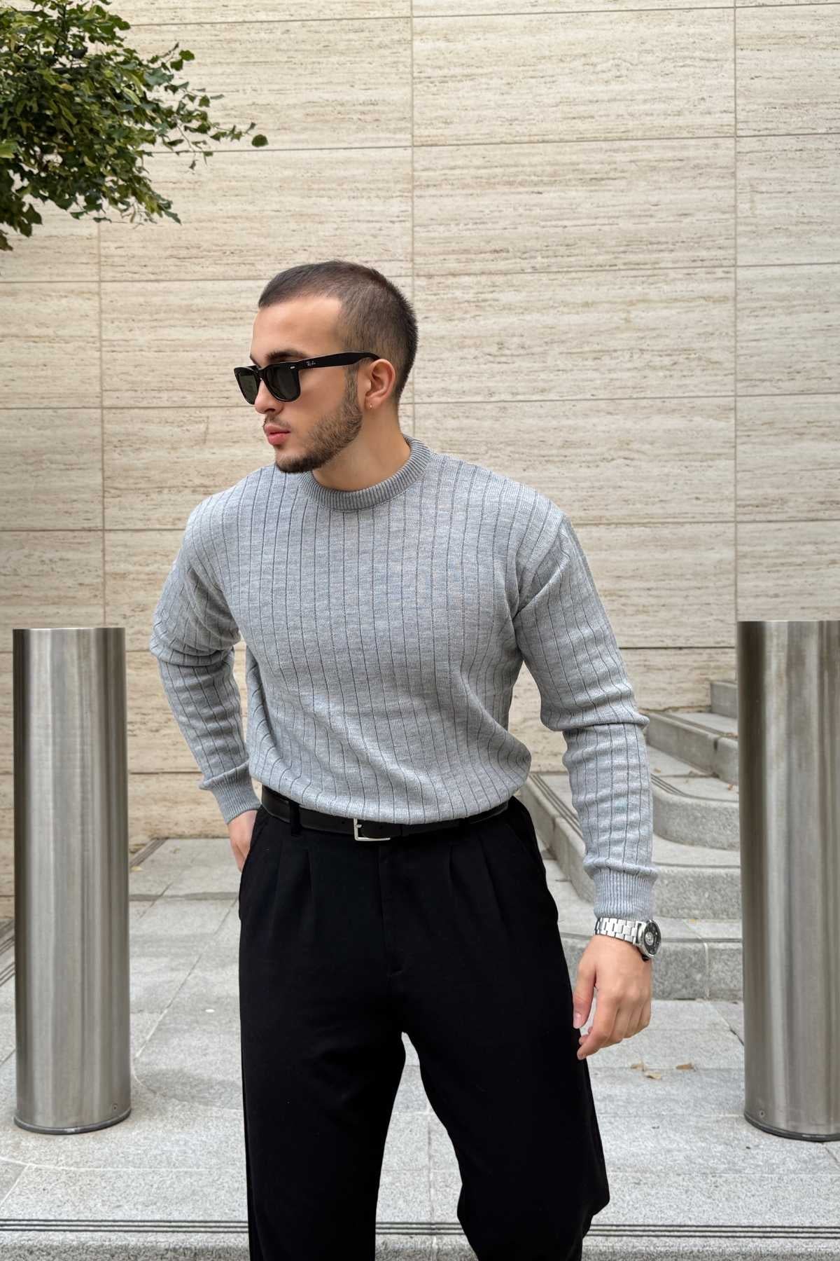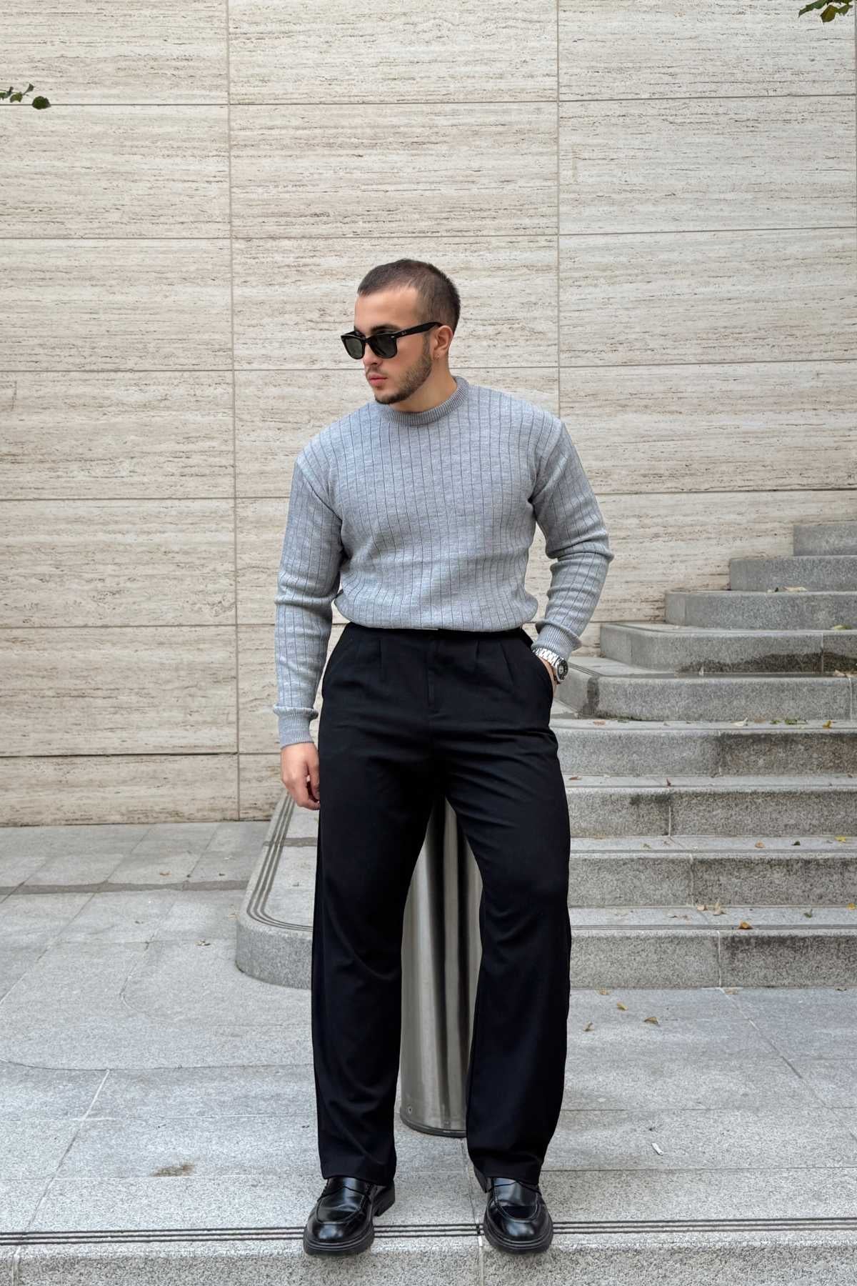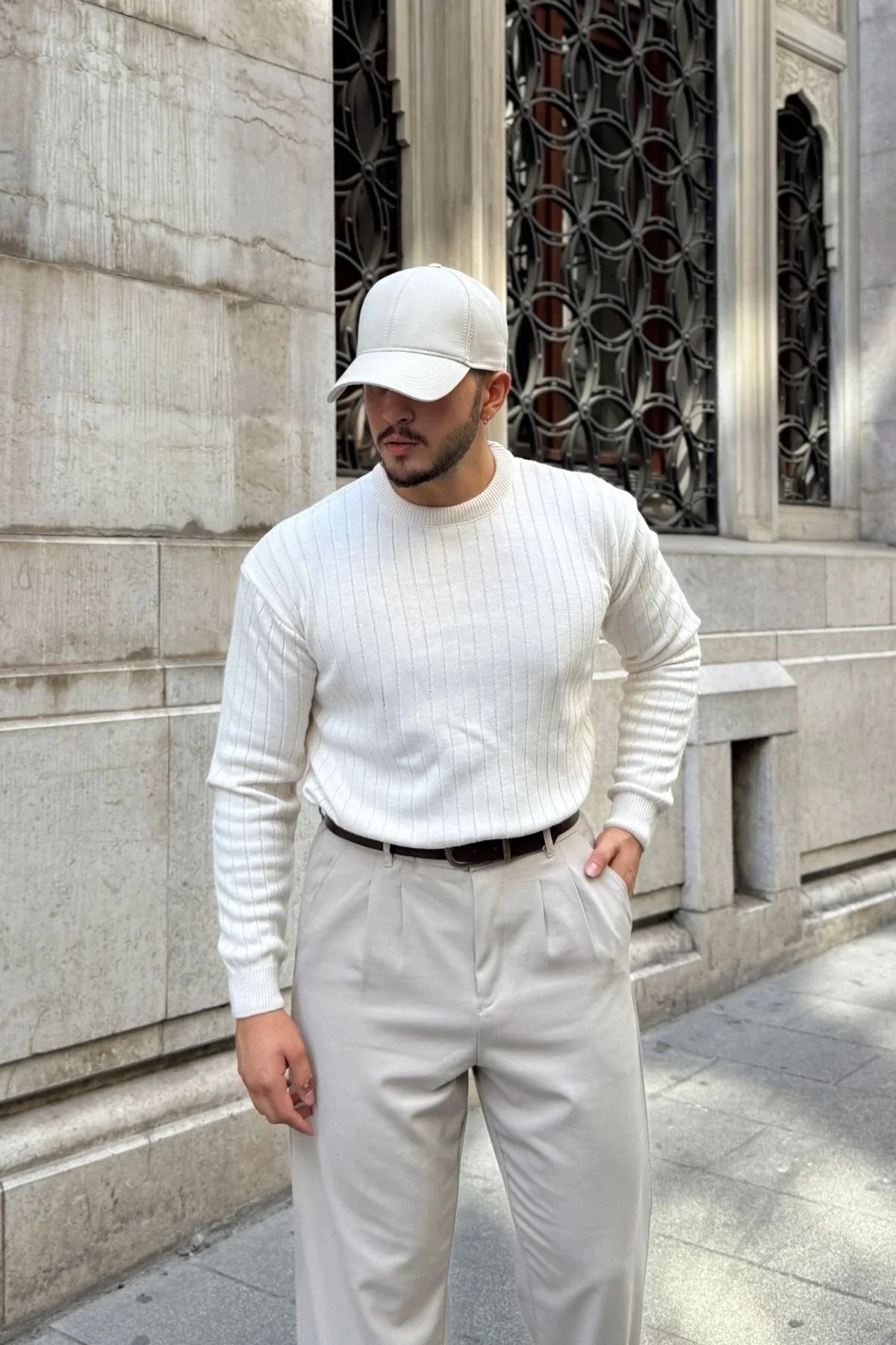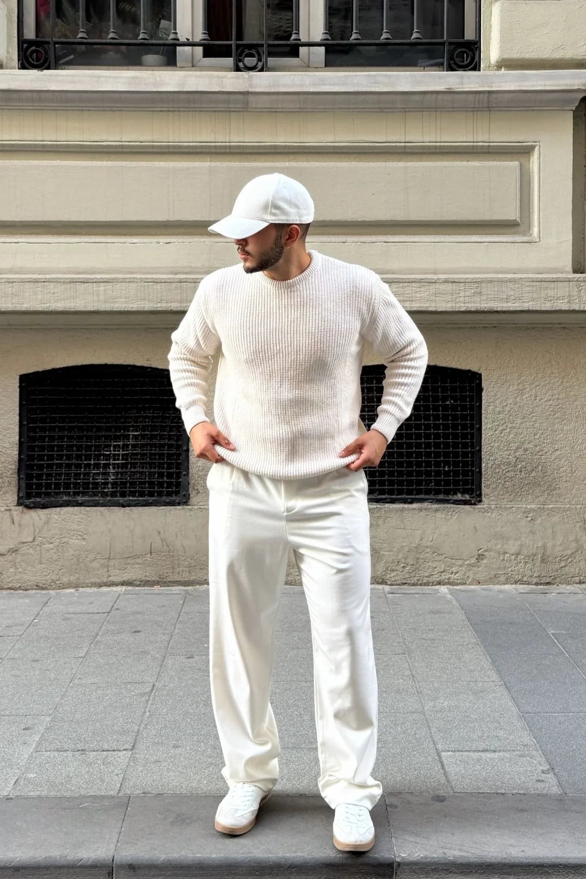 Triko kazaklar, kumaş baggy pantolon ve deri kemerle rahat ve modern bir görünüm yaratır. Kadife uzun kollu gömlek ceketler veya kadife yaka günlük ceketlerimizle farklı stiller oluşturulabilir.