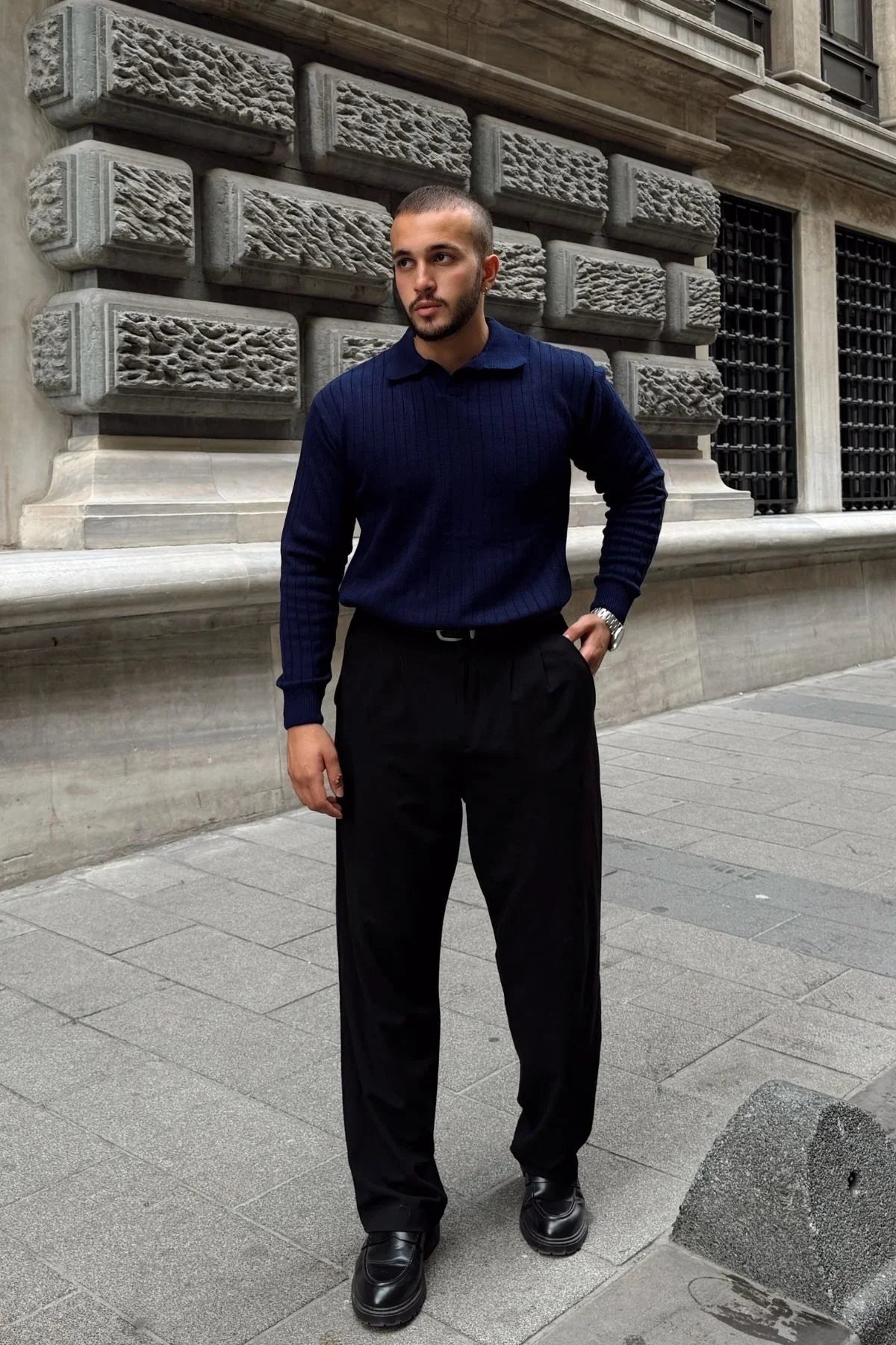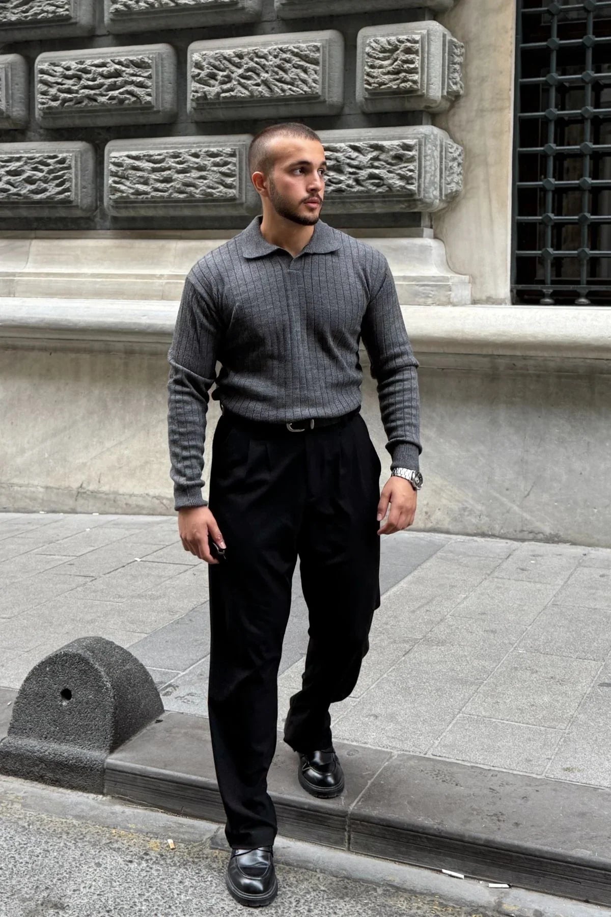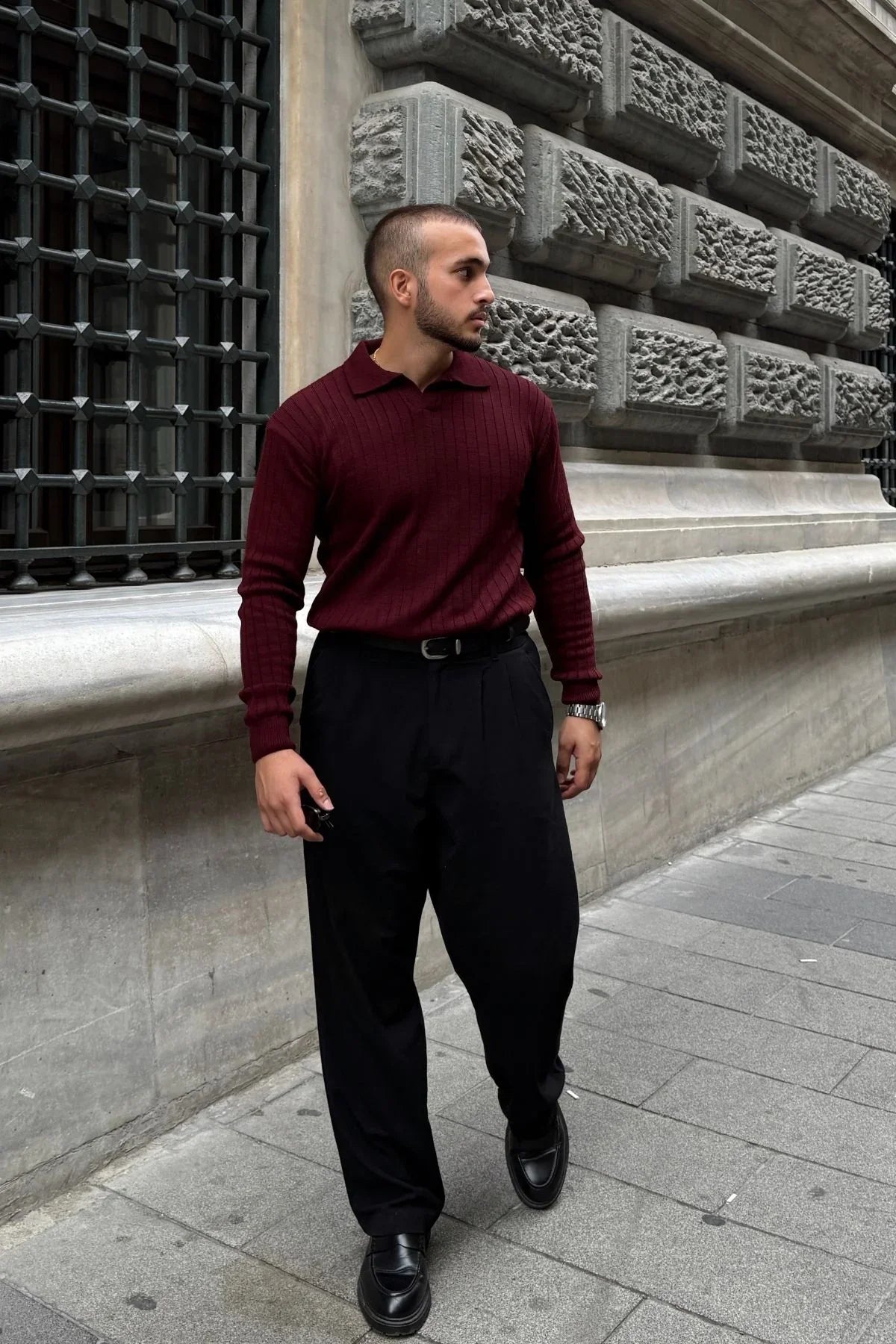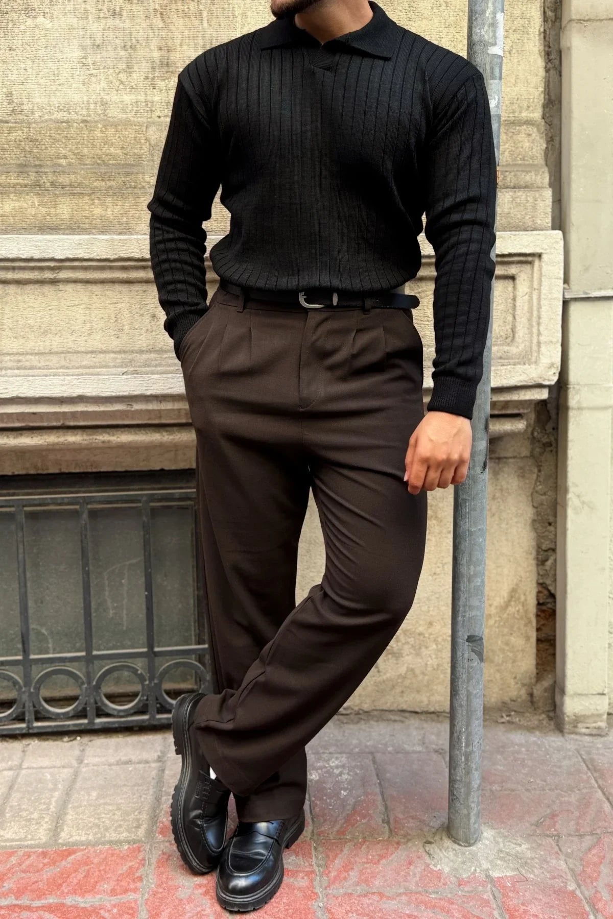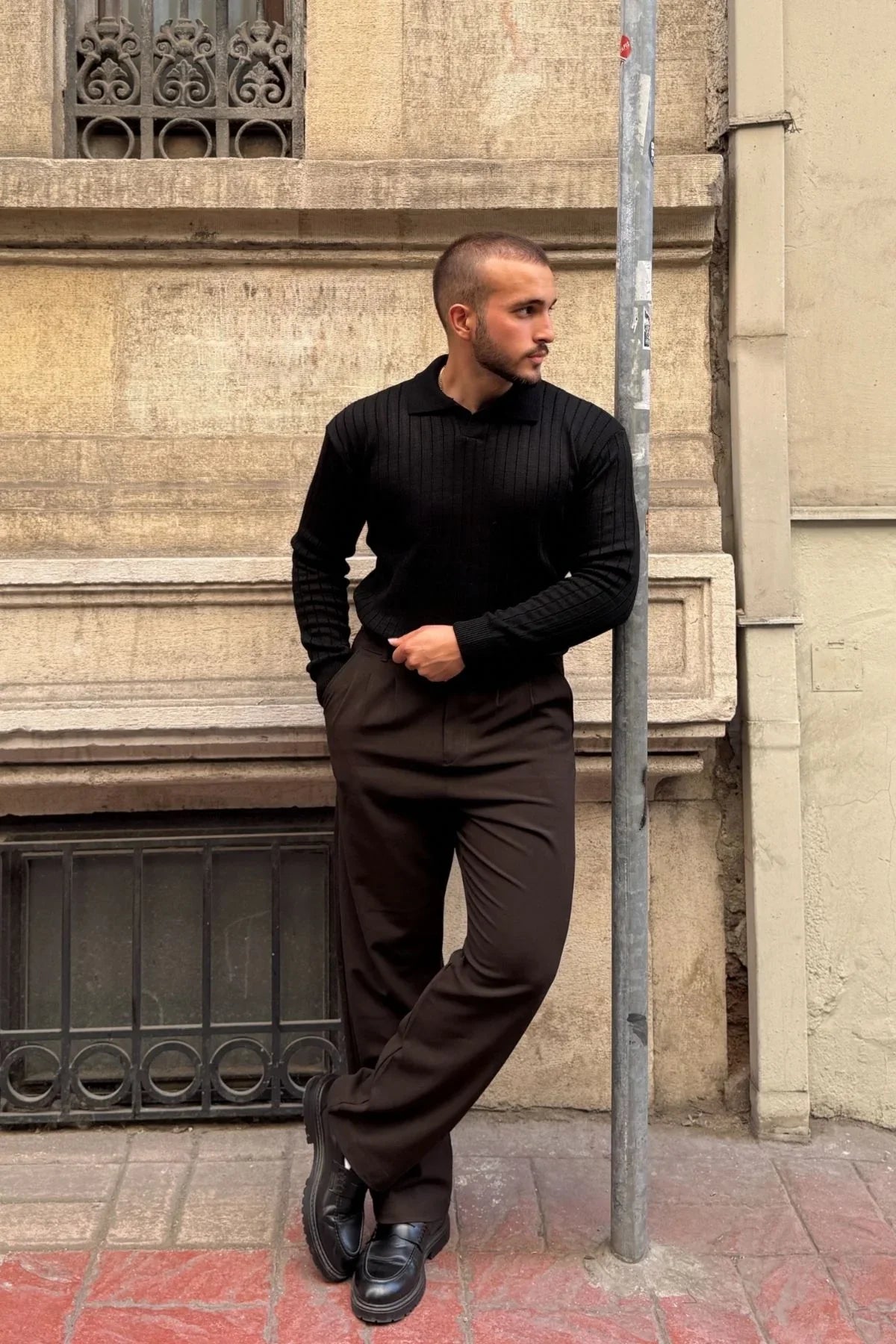 Triko polo yaka uzun kollu tişört, kumaş baggy kalıp pantolon ve deri kemer ile kombinlendiğinde size ofis şıklığını sağlayacaktır. Klasik deri ayakkabı ile tamamlandığında ciddi ve şık bir görünüm sağlar.