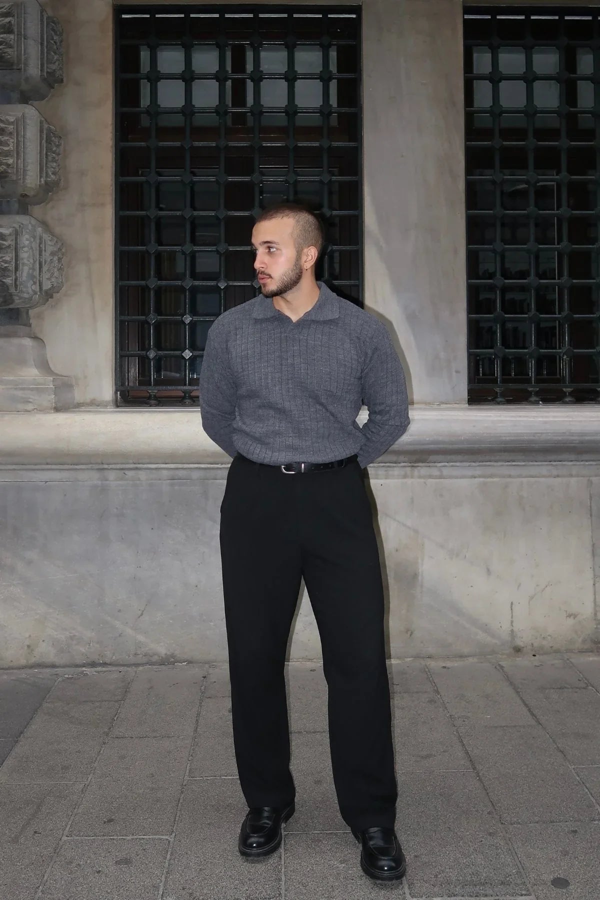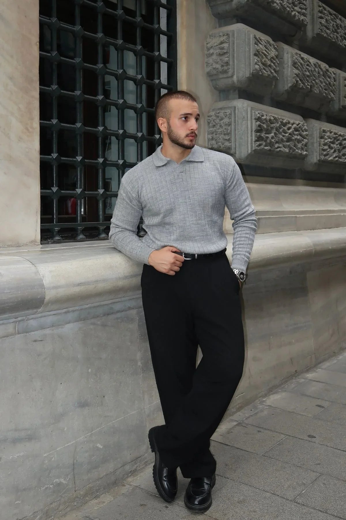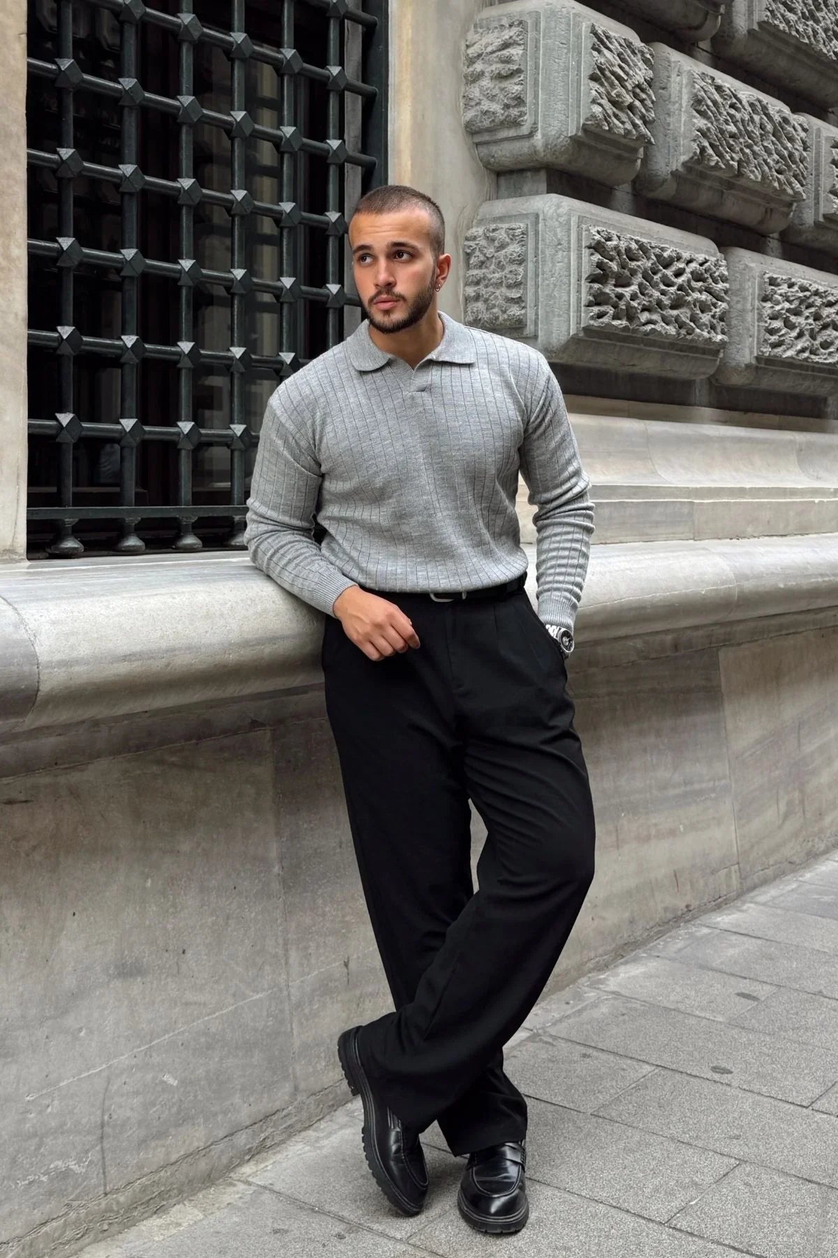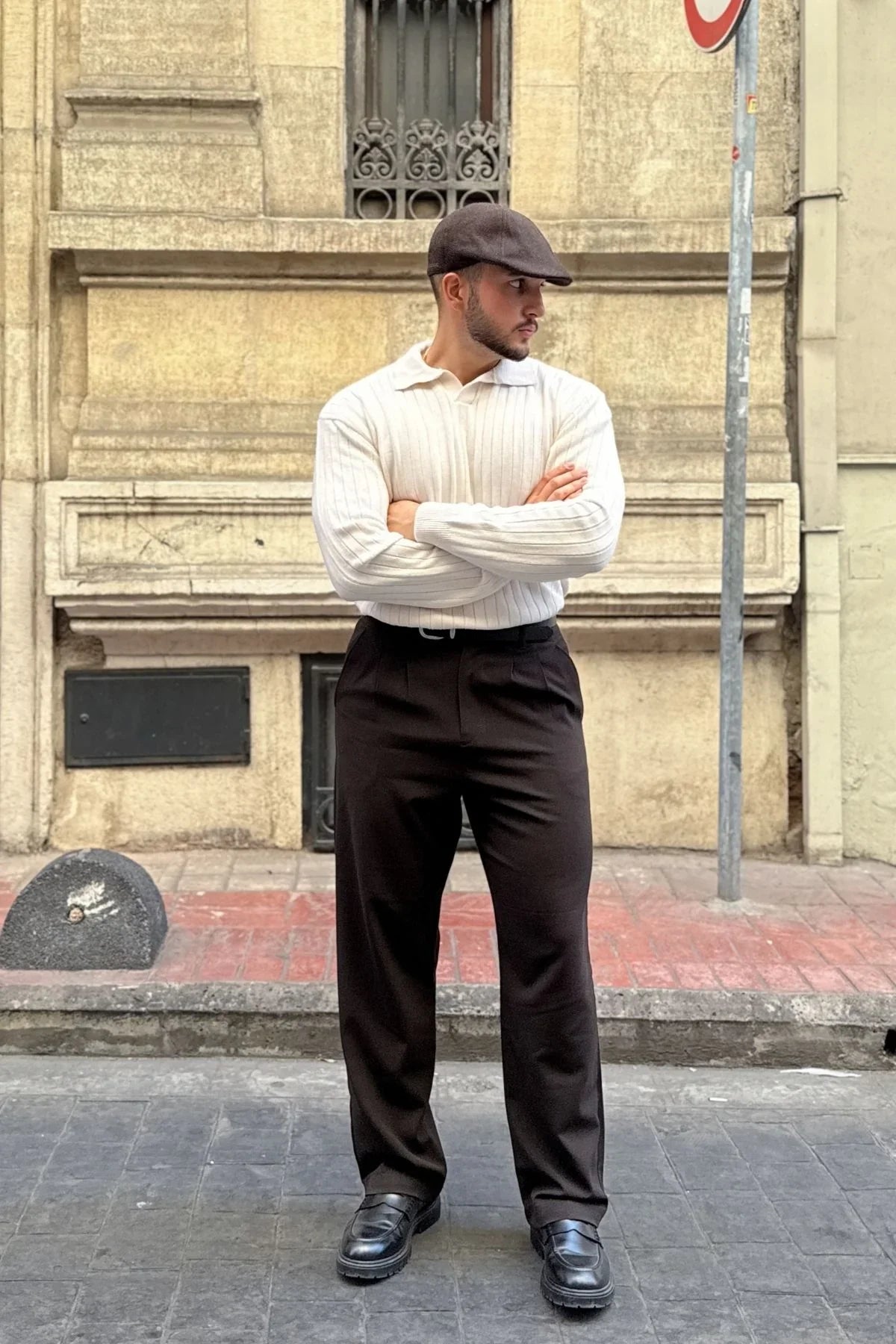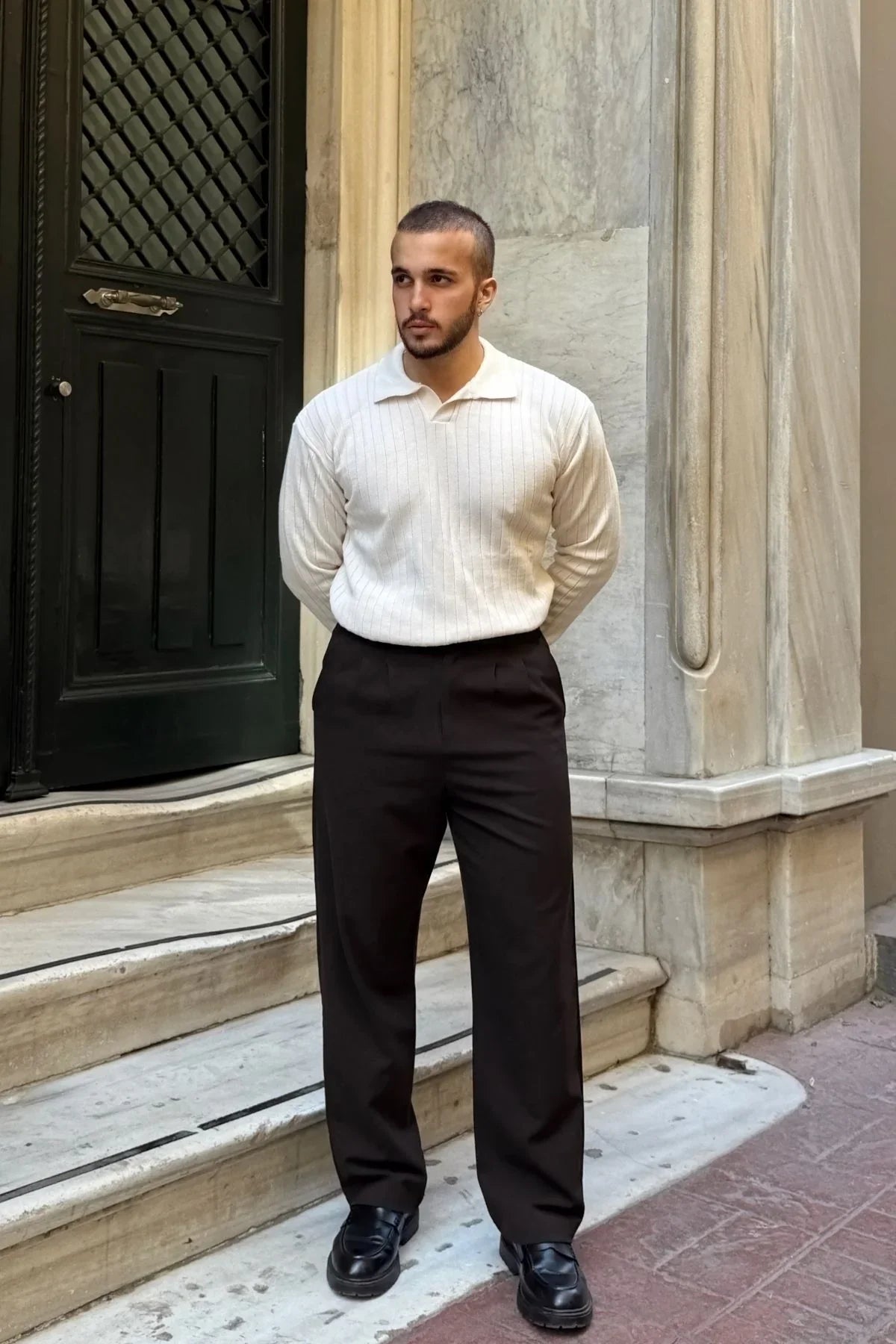 Triko polo yaka uzun kollu tişört, kumaş baggy kalıp pantolon ve deri kemer ile kombinlendiğinde size ofis şıklığını sağlayacaktır. Klasik deri ayakkabı ile tamamlandığında ciddi ve şık bir görünüm sağlar.