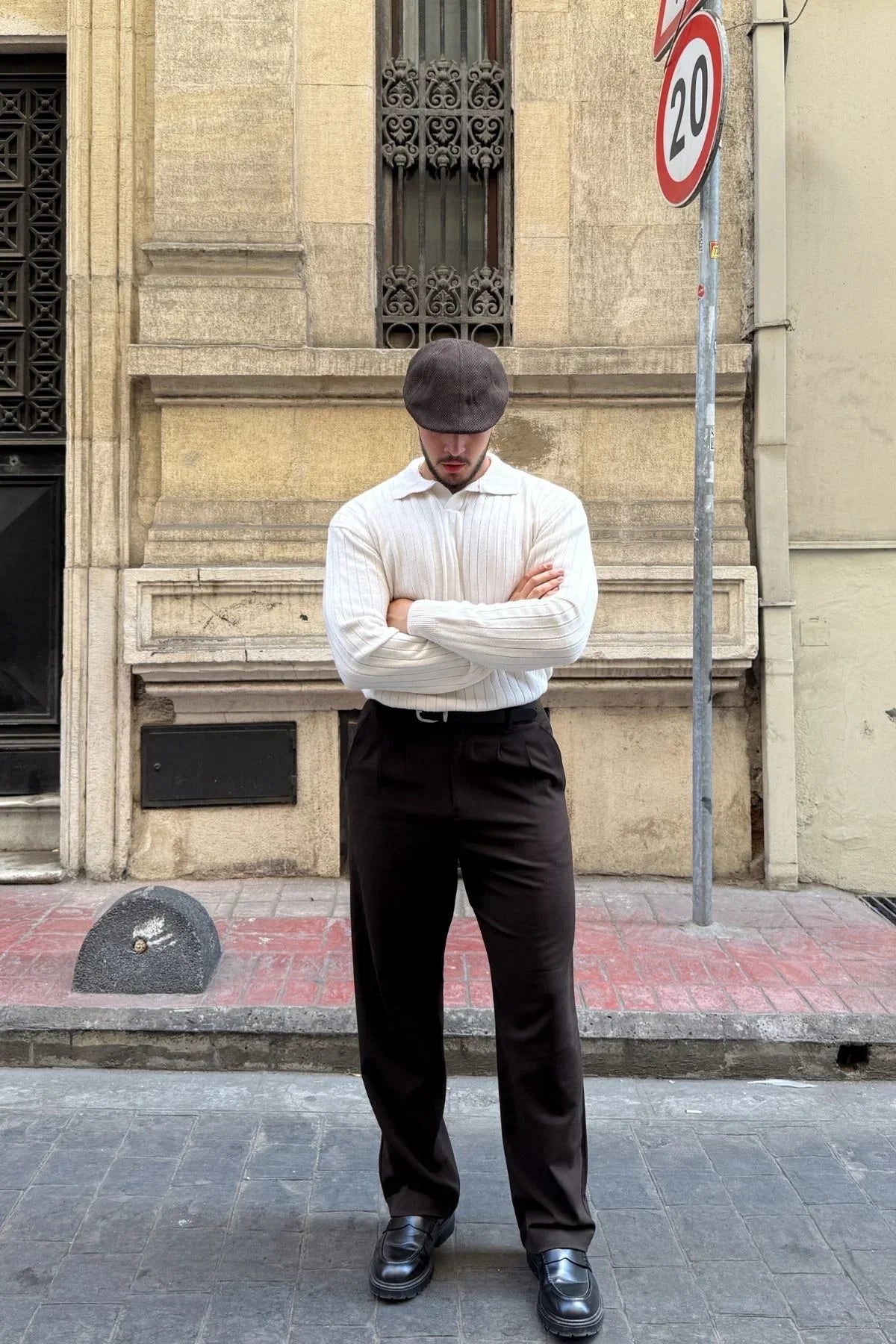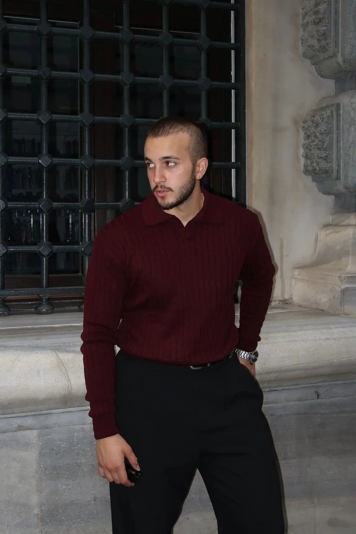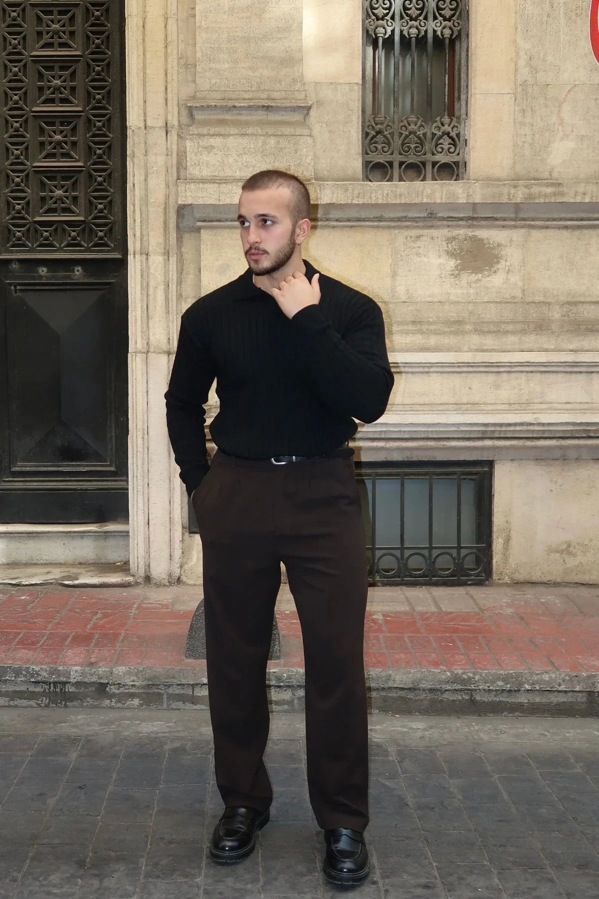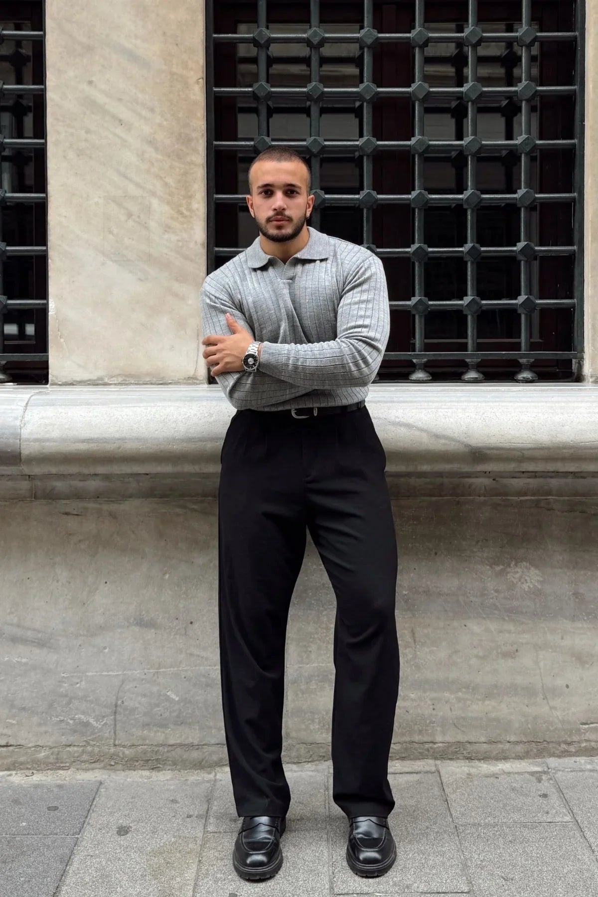 Triko polo yaka uzun kollu tişört, kumaş baggy kalıp pantolon ve deri kemer ile kombinlendiğinde size ofis şıklığını sağlayacaktır. Klasik deri ayakkabı ile tamamlandığında ciddi ve şık bir görünüm sağlar.