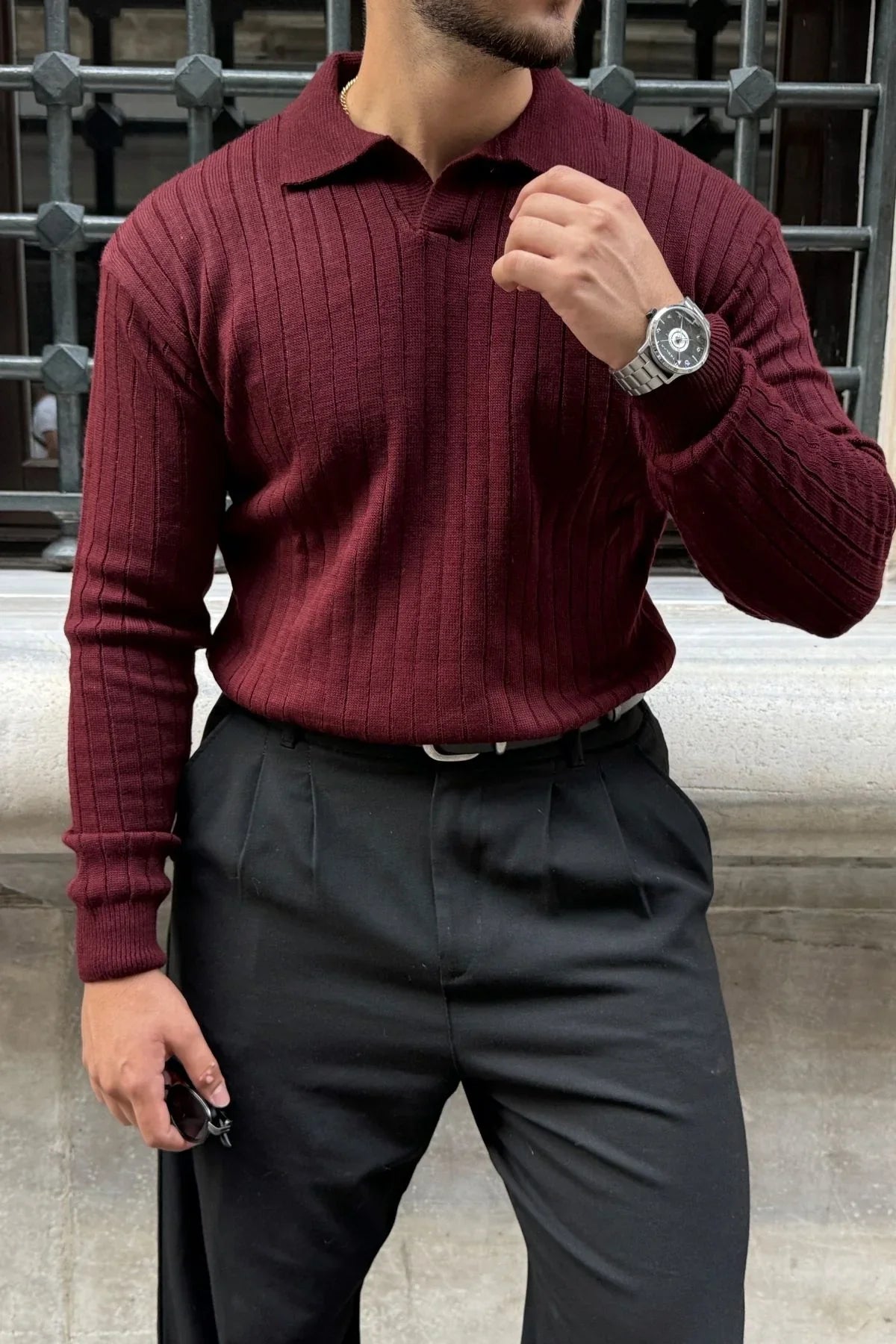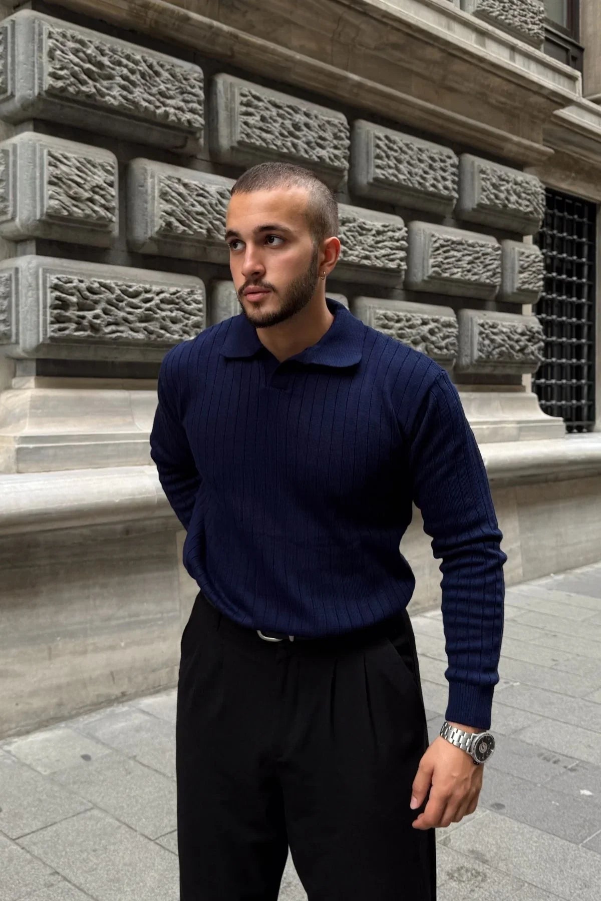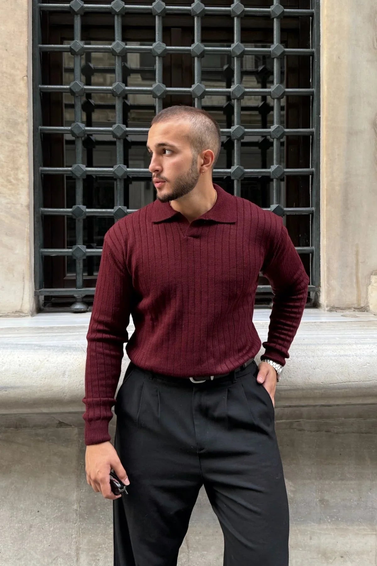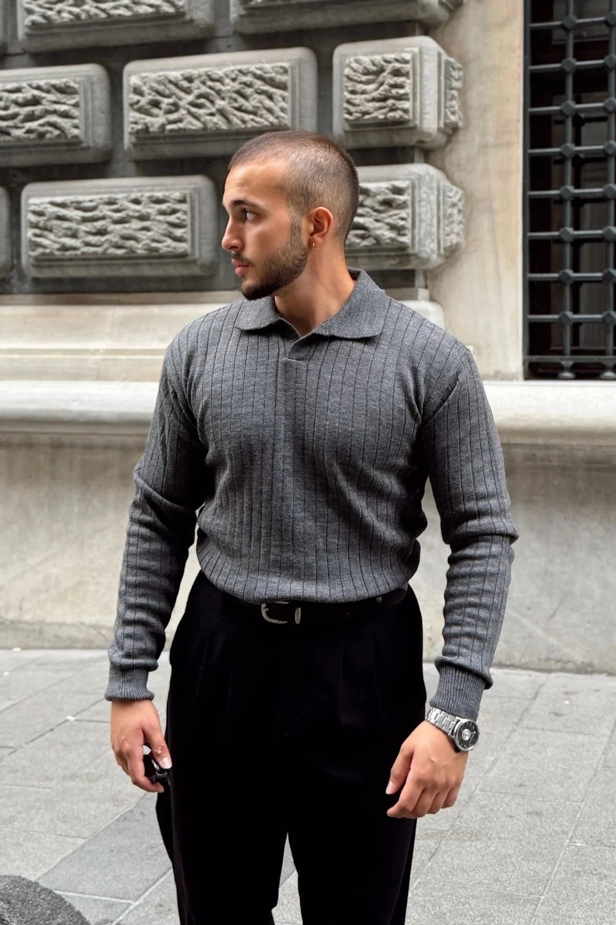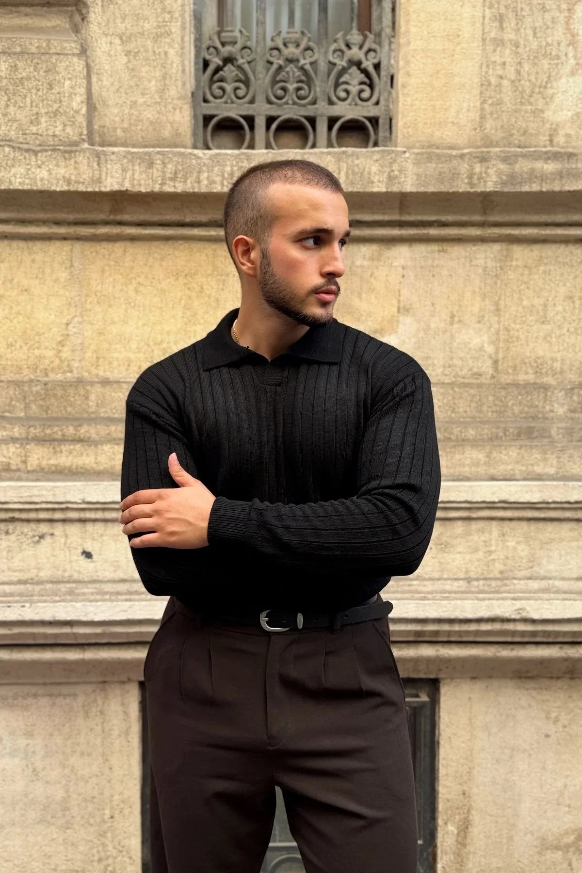Triko polo yaka uzun kollu tişört, kumaş baggy kalıp pantolon ve deri kemer ile kombinlendiğinde size ofis şıklığını sağlayacaktır. Klasik deri ayakkabı ile tamamlandığında ciddi ve şık bir görünüm sağlar.