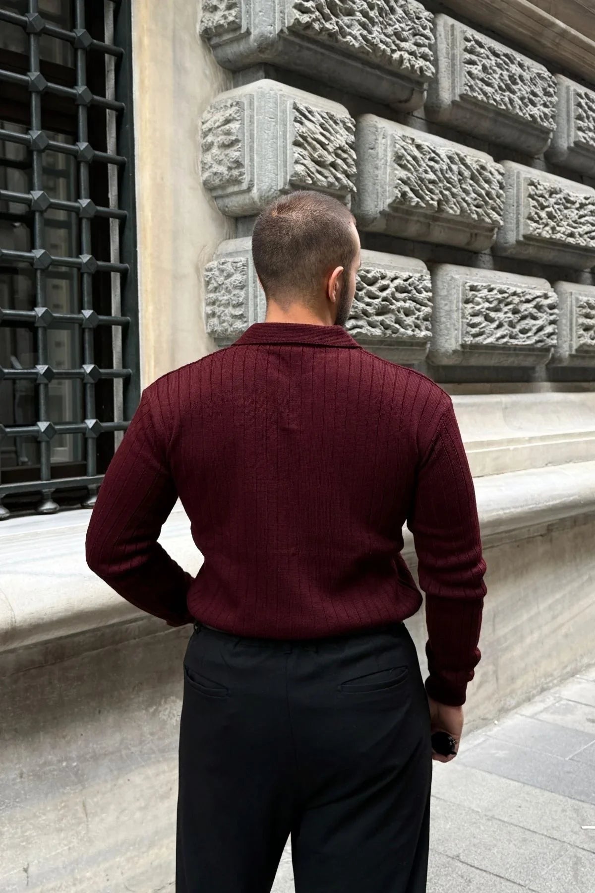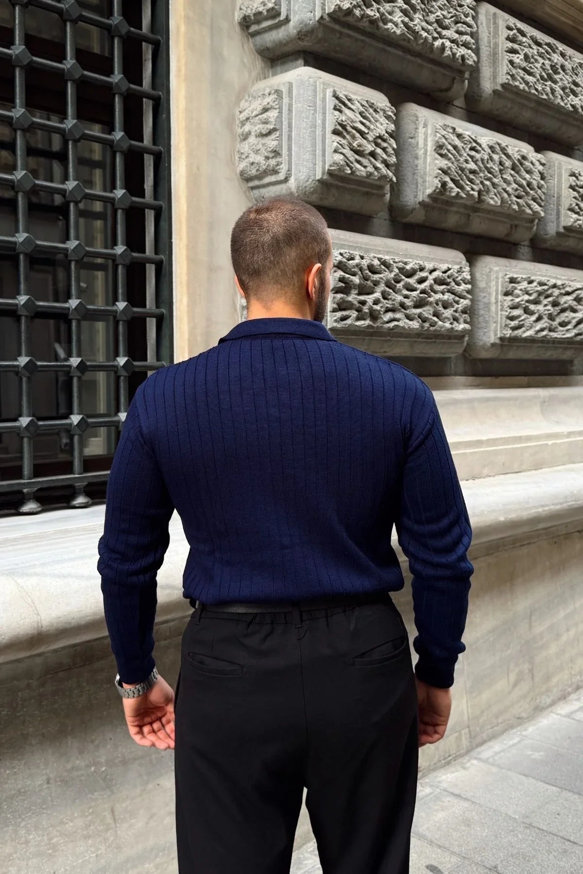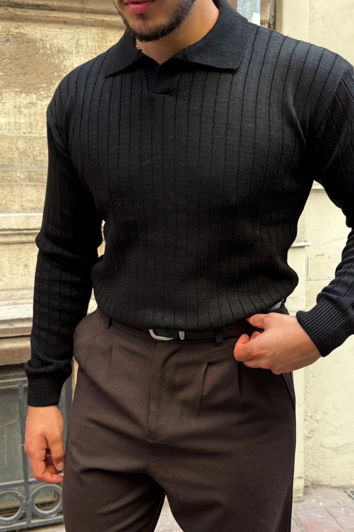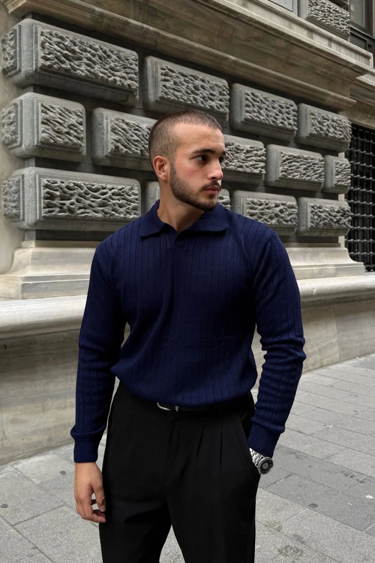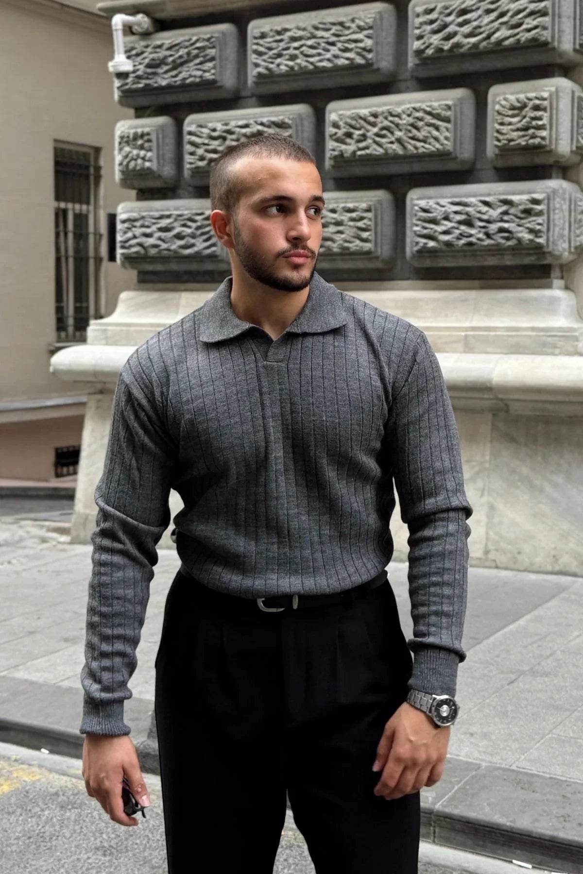 Triko polo yaka uzun kollu tişört, kumaş baggy kalıp pantolon ve deri kemer ile kombinlendiğinde size ofis şıklığını sağlayacaktır. Klasik deri ayakkabı ile tamamlandığında ciddi ve şık bir görünüm sağlar.